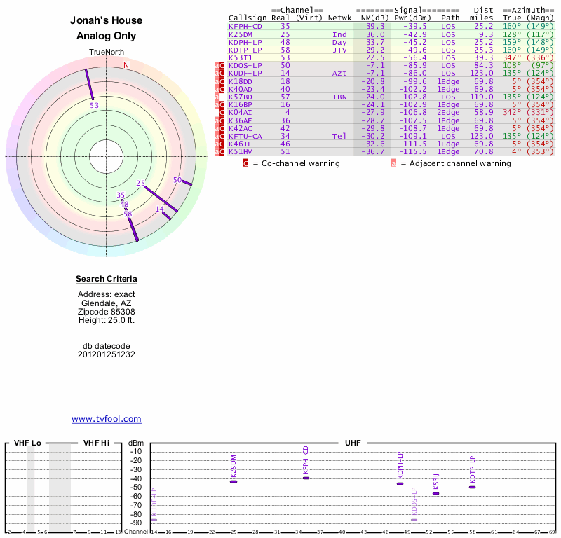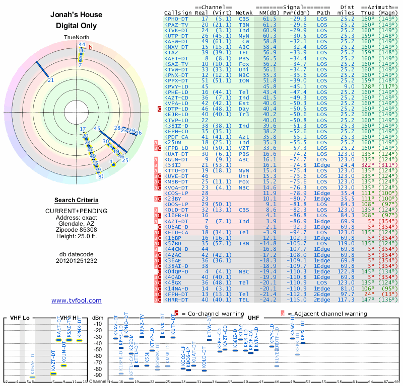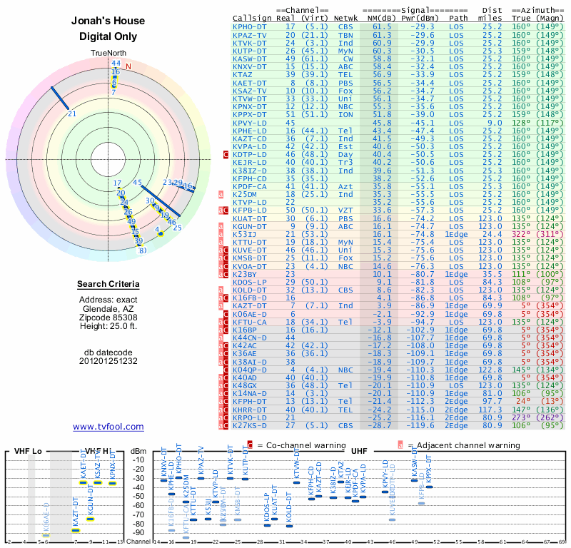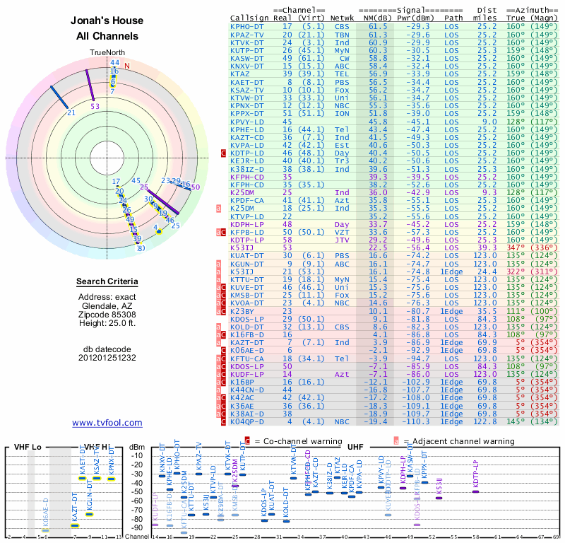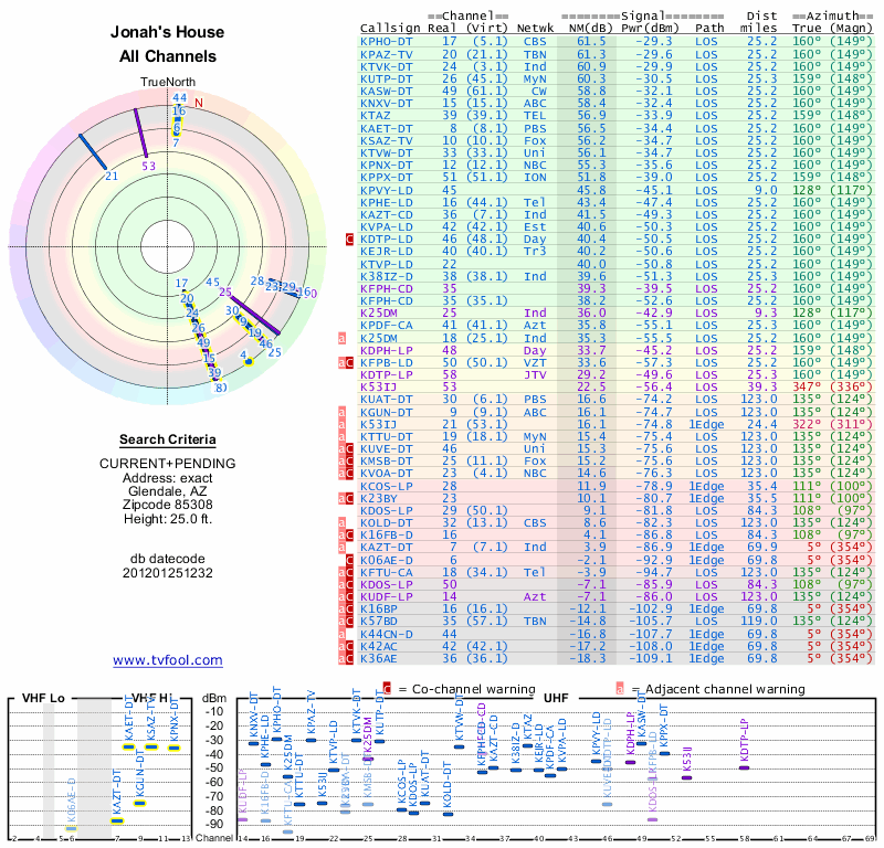 Here are the results for your location. The transmitter database was last updated on June 7, 2013. For more information about these plots and how to interpret them, please check out the Signal Analysis FAQ.
