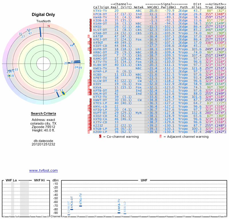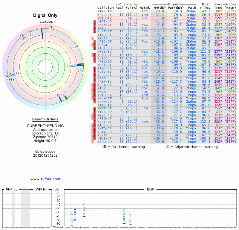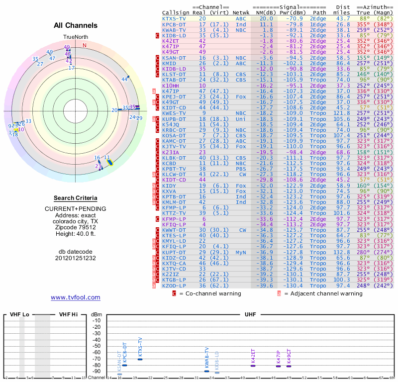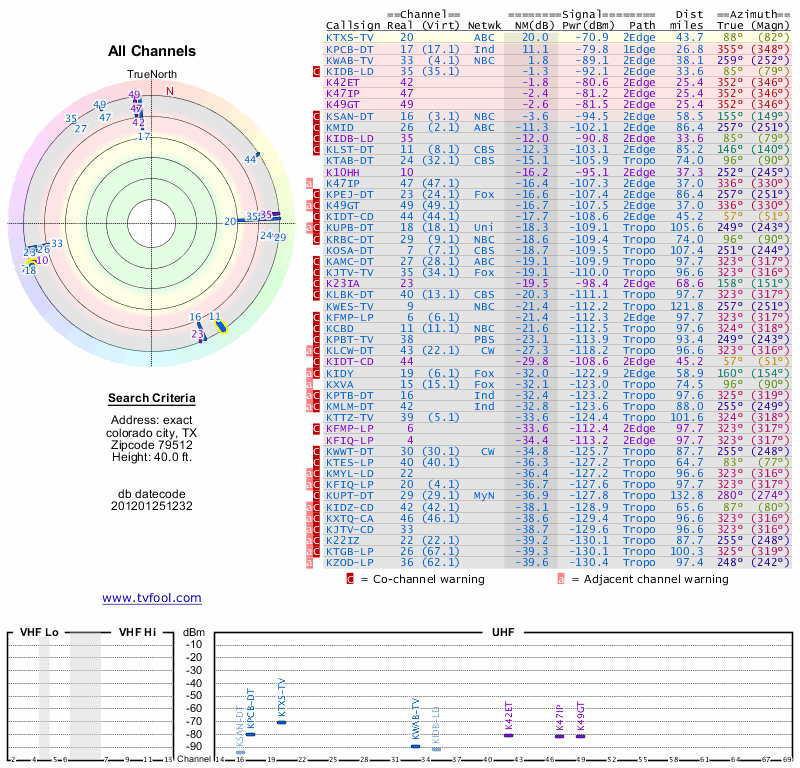 Here are the results for your location. The transmitter database was last updated on June 7, 2013. For more information about these plots and how to interpret them, please check out the Signal Analysis FAQ.