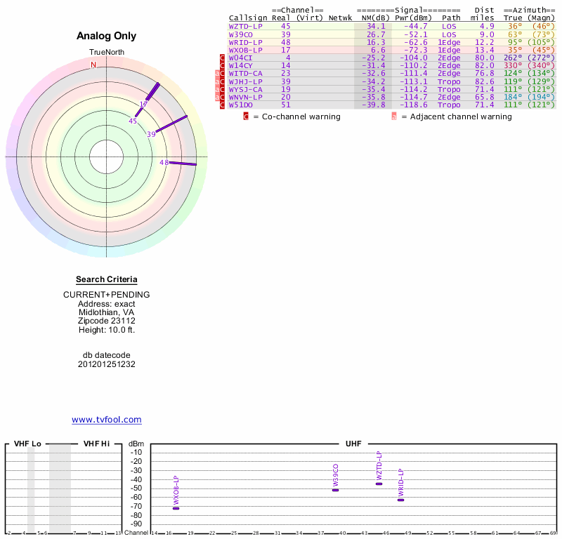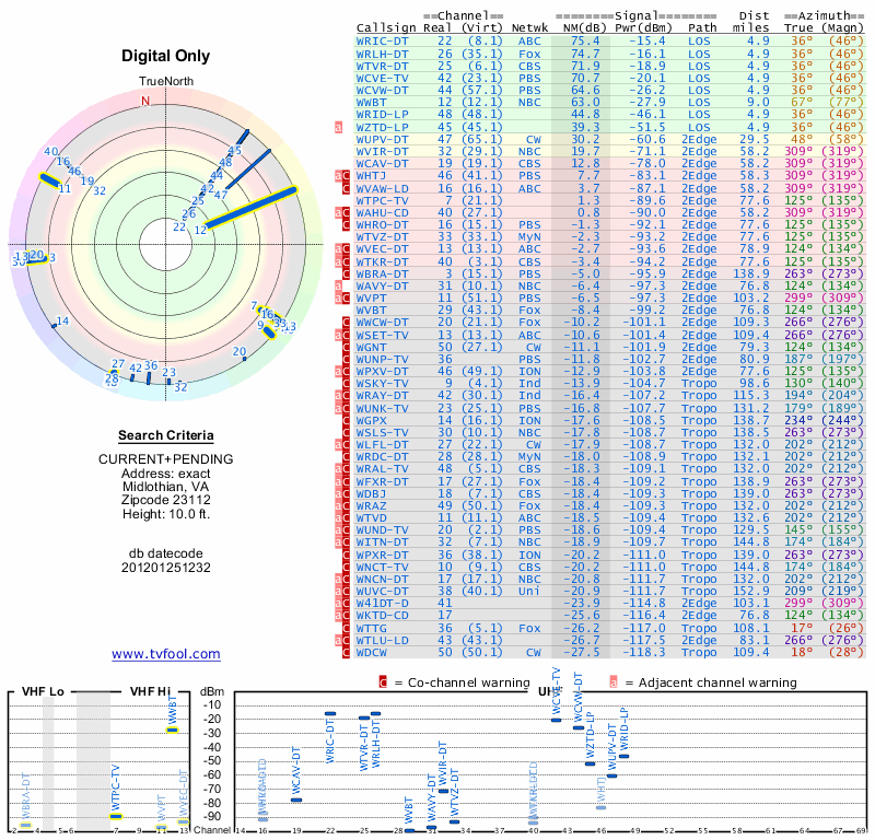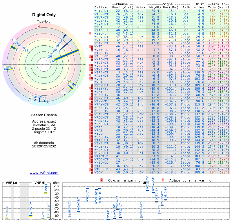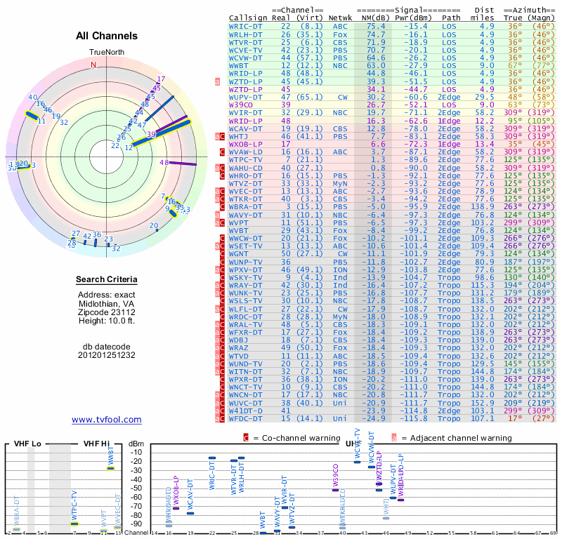 Here are the results for your location. The transmitter database was last updated on June 7, 2013. For more information about these plots and how to interpret them, please check out the Signal Analysis FAQ.