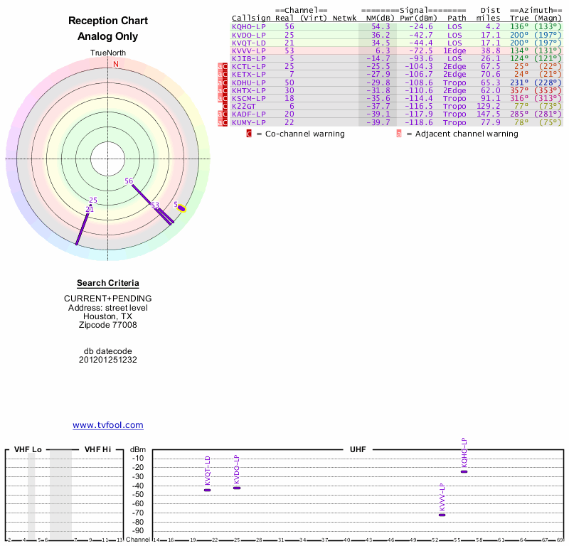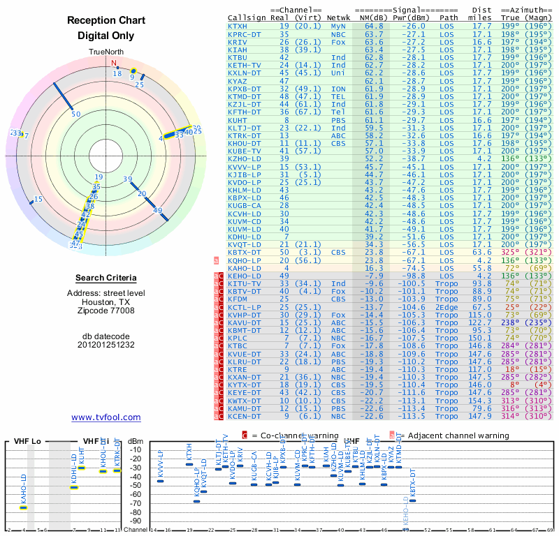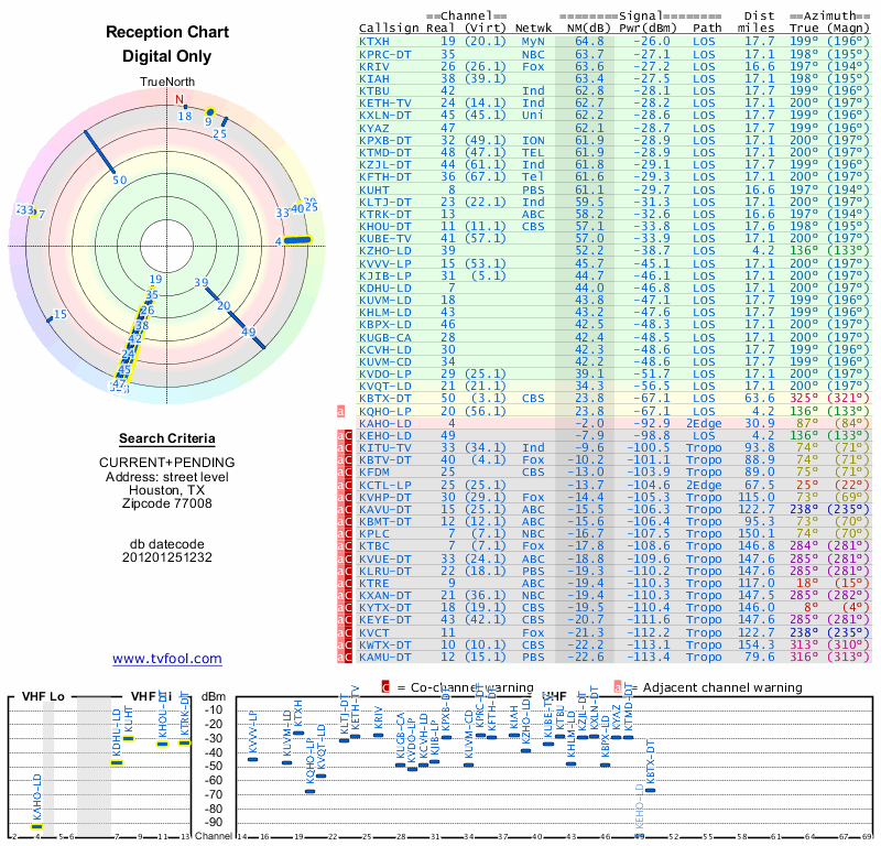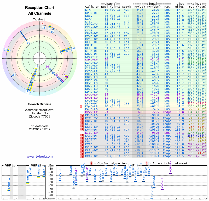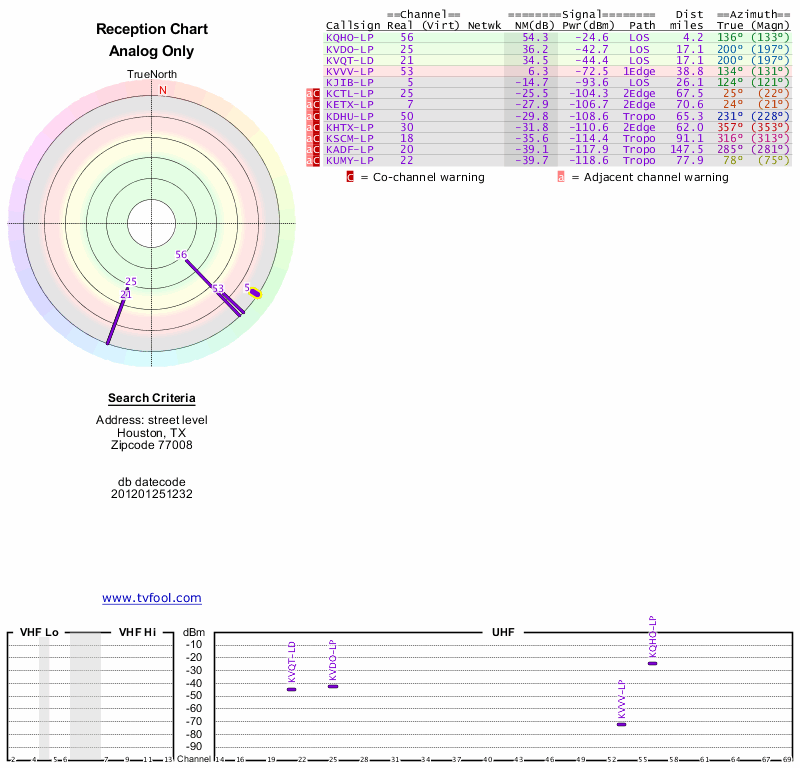 Here are the results for your location. The transmitter database was last updated on June 7, 2013. For more information about these plots and how to interpret them, please check out the Signal Analysis FAQ.