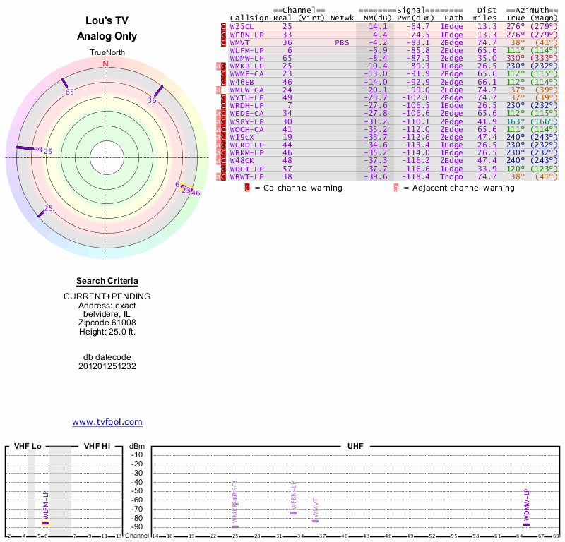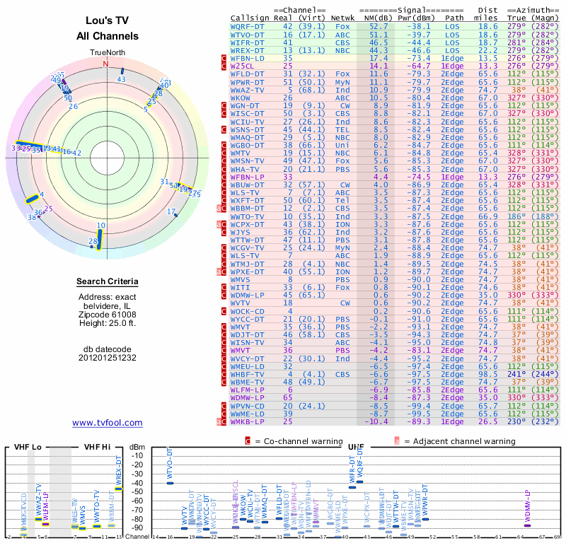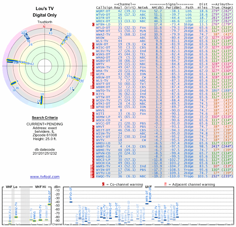 Here are the results for your location. The transmitter database was last updated on June 7, 2013. For more information about these plots and how to interpret them, please check out the Signal Analysis FAQ.