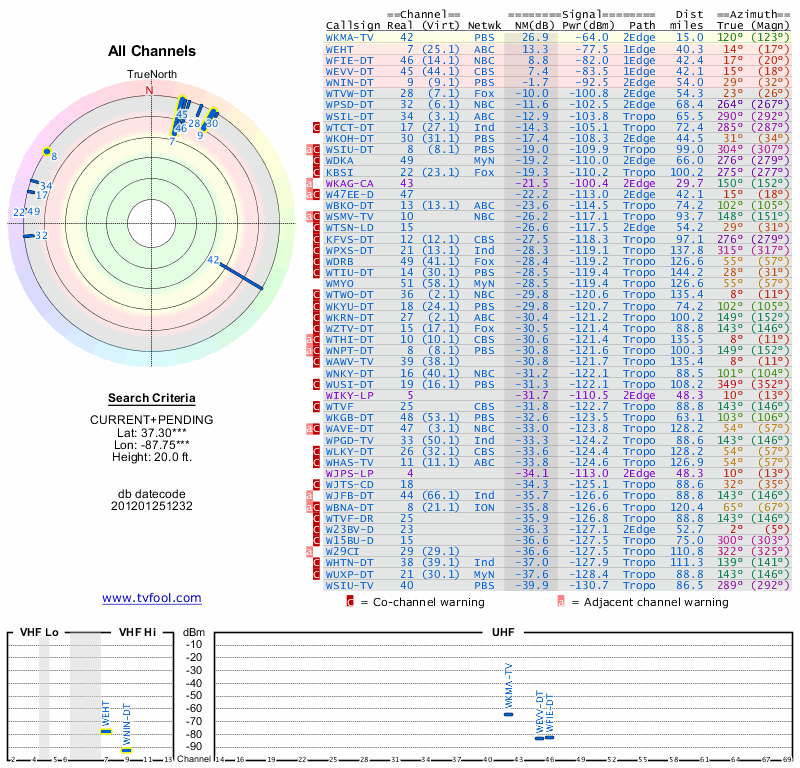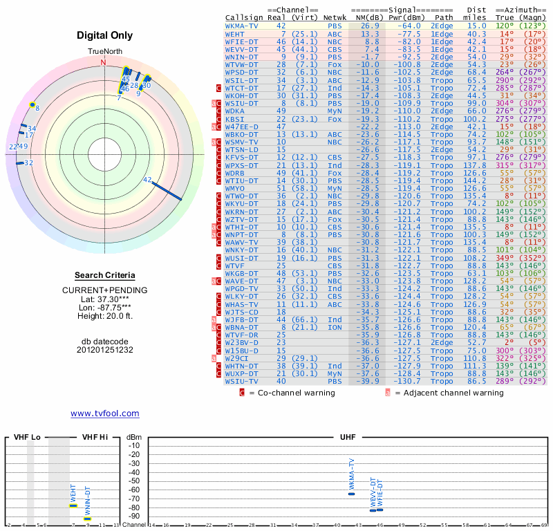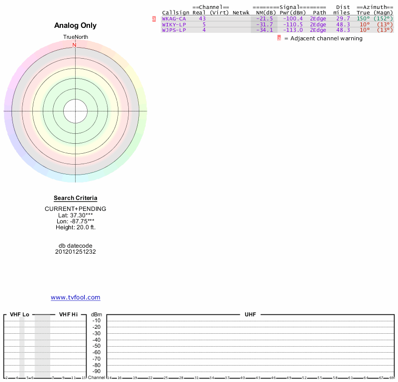 Here are the results for your location. The transmitter database was last updated on June 7, 2013. For more information about these plots and how to interpret them, please check out the Signal Analysis FAQ.
