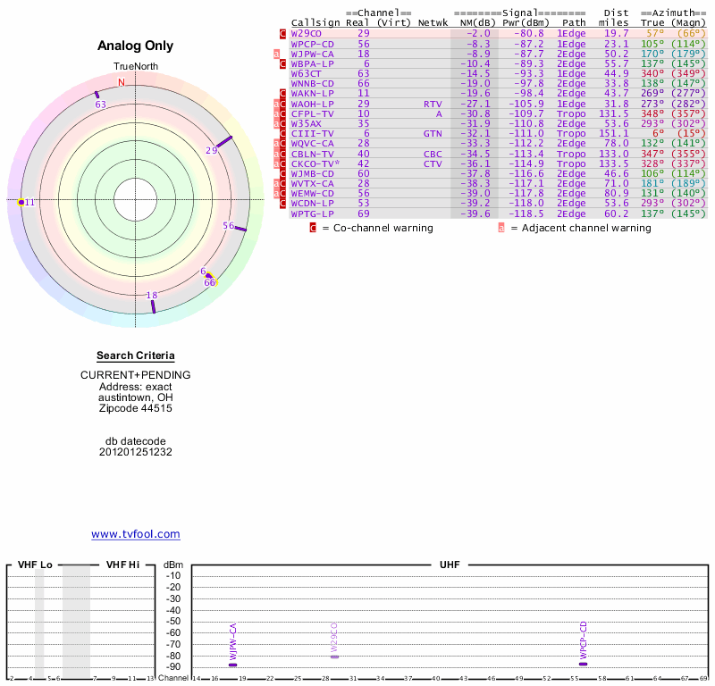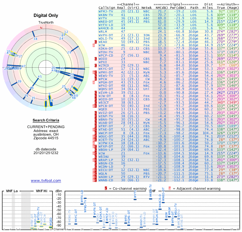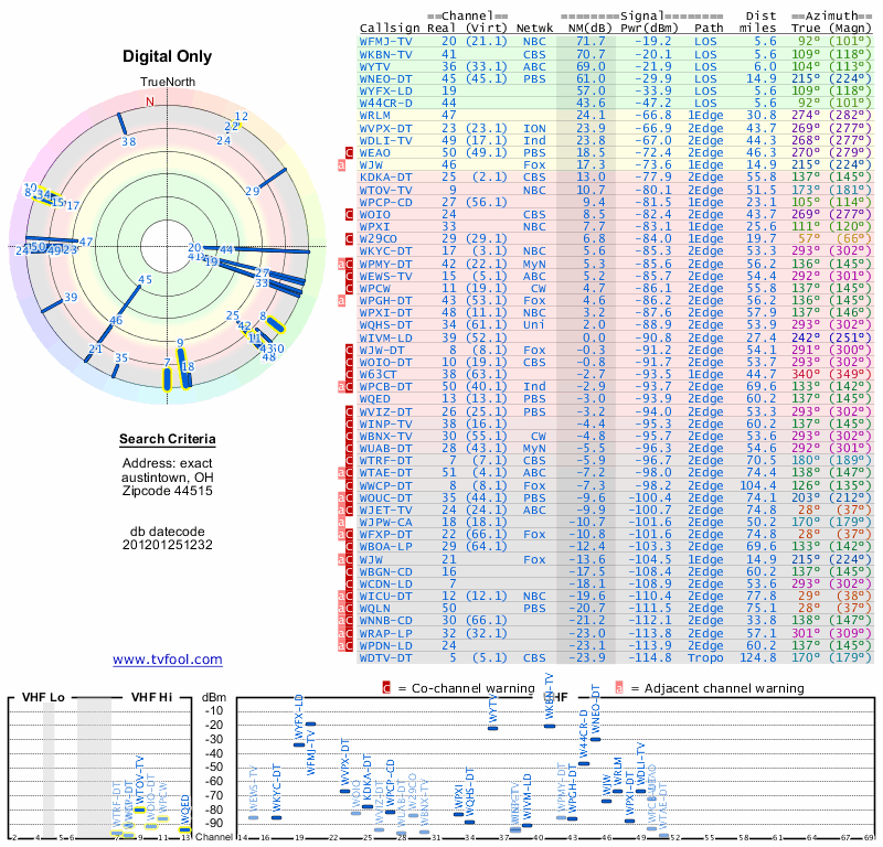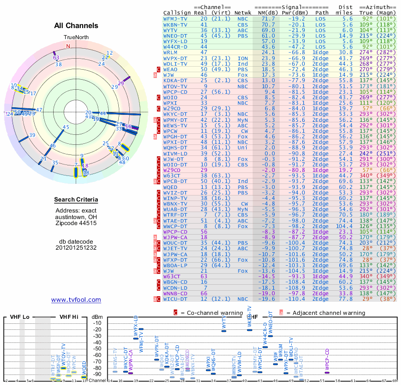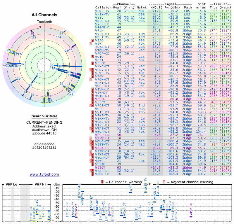 Here are the results for your location. The transmitter database was last updated on June 7, 2013. For more information about these plots and how to interpret them, please check out the Signal Analysis FAQ.