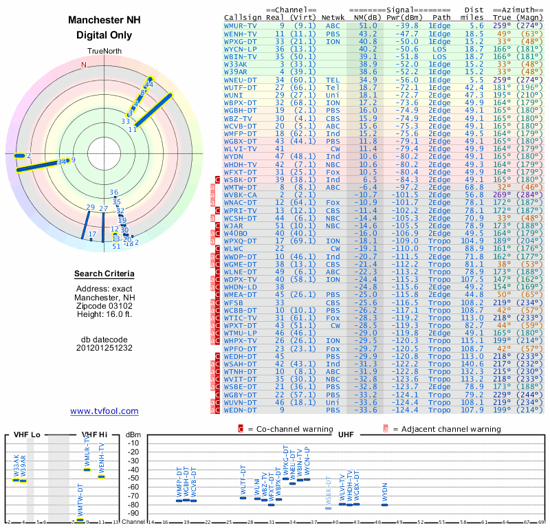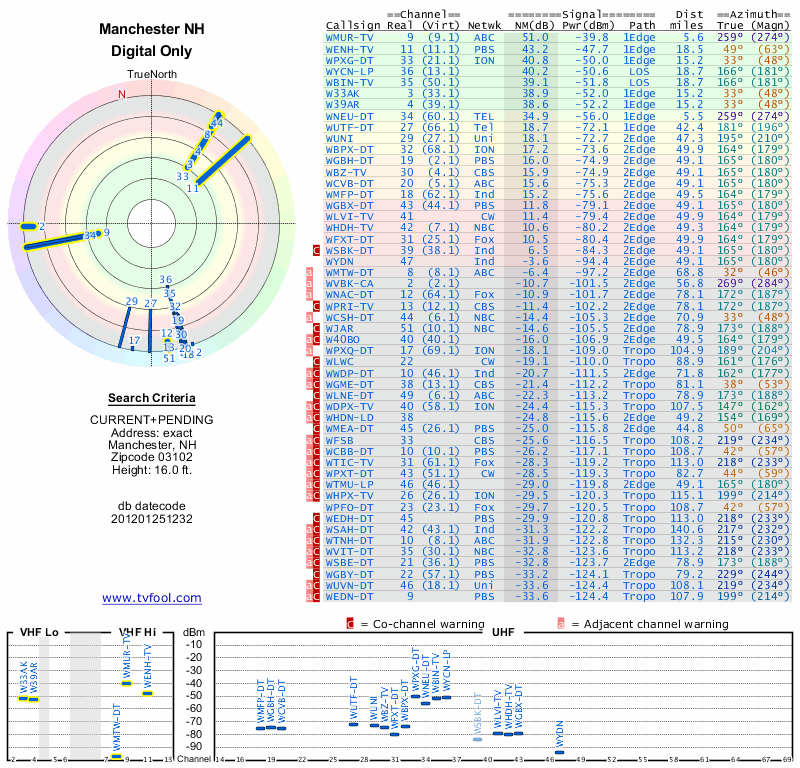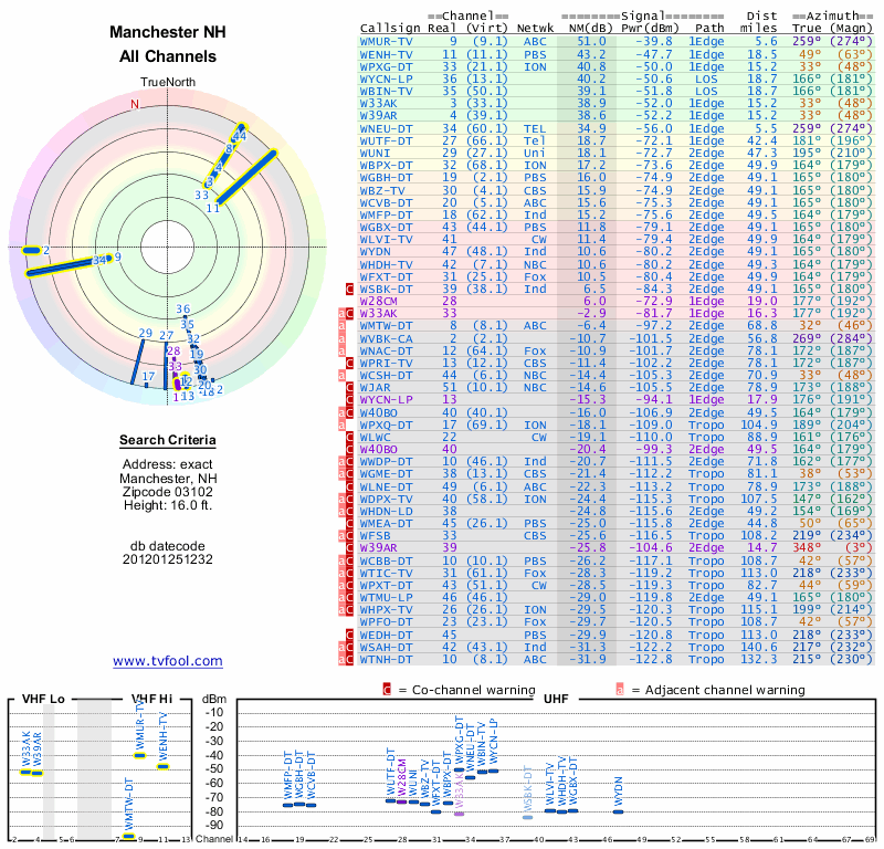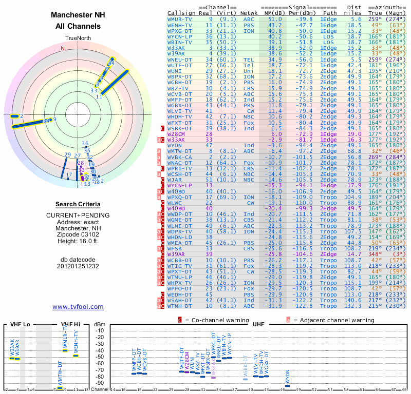 Here are the results for your location. The transmitter database was last updated on June 7, 2013. For more information about these plots and how to interpret them, please check out the Signal Analysis FAQ.