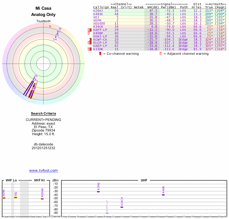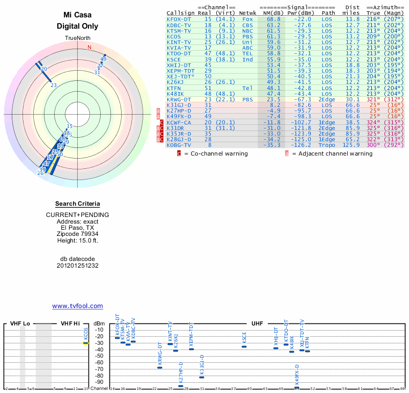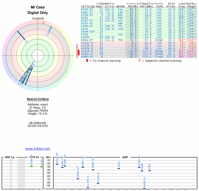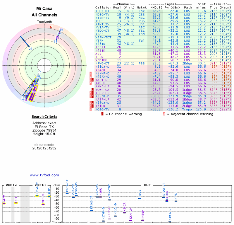 Here are the results for your location. The transmitter database was last updated on June 7, 2013. For more information about these plots and how to interpret them, please check out the Signal Analysis FAQ.