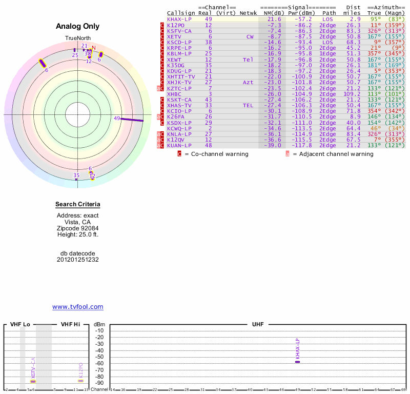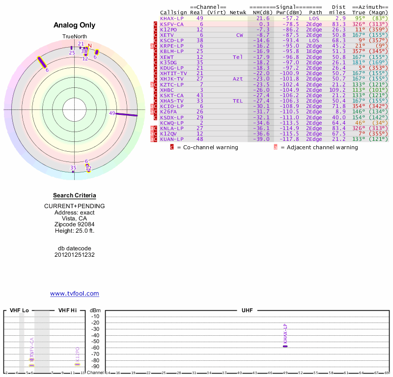 Here are the results for your location. The transmitter database was last updated on June 7, 2013. For more information about these plots and how to interpret them, please check out the Signal Analysis FAQ.