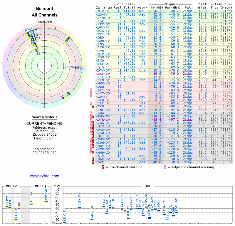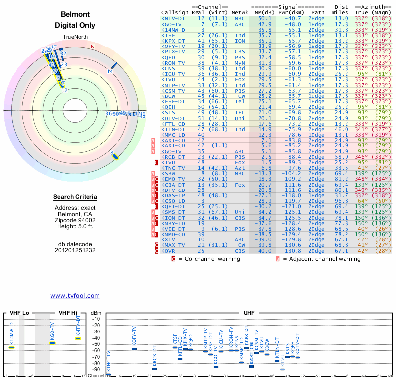 Here are the results for your location. The transmitter database was last updated on June 7, 2013. For more information about these plots and how to interpret them, please check out the Signal Analysis FAQ.