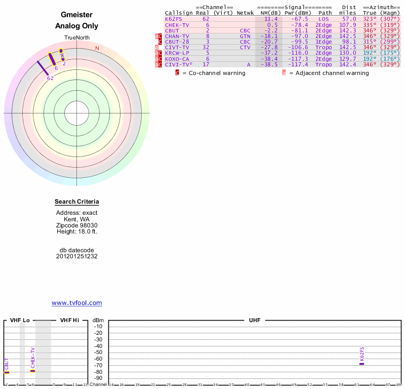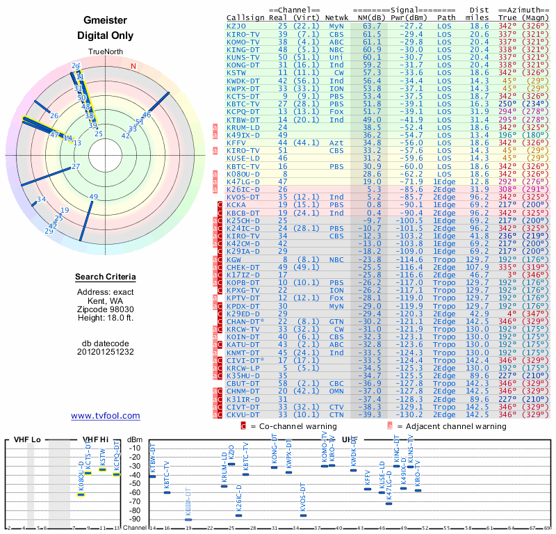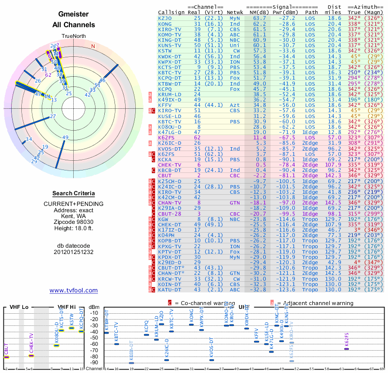 Here are the results for your location. The transmitter database was last updated on June 7, 2013. For more information about these plots and how to interpret them, please check out the Signal Analysis FAQ.