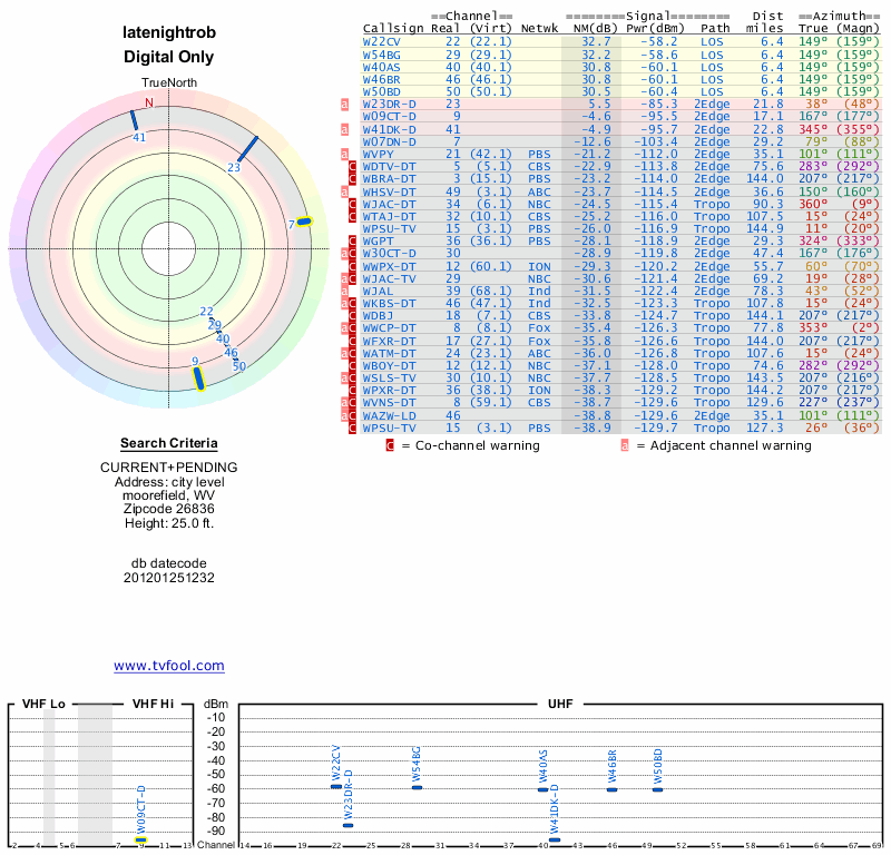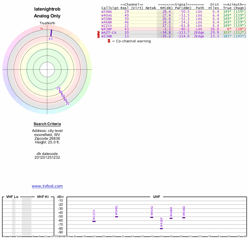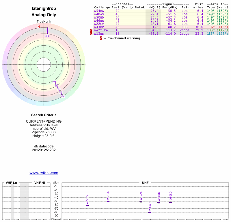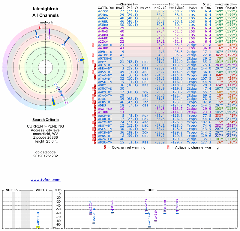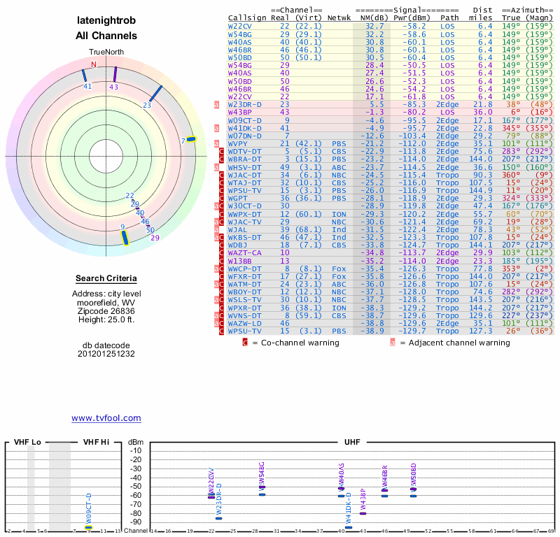 Here are the results for your location. The transmitter database was last updated on June 7, 2013. For more information about these plots and how to interpret them, please check out the Signal Analysis FAQ.
