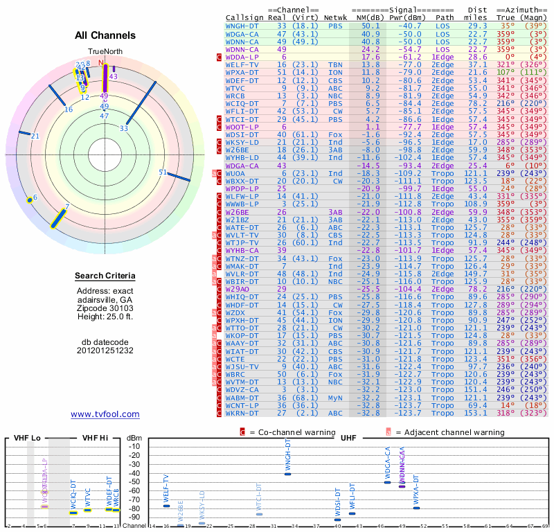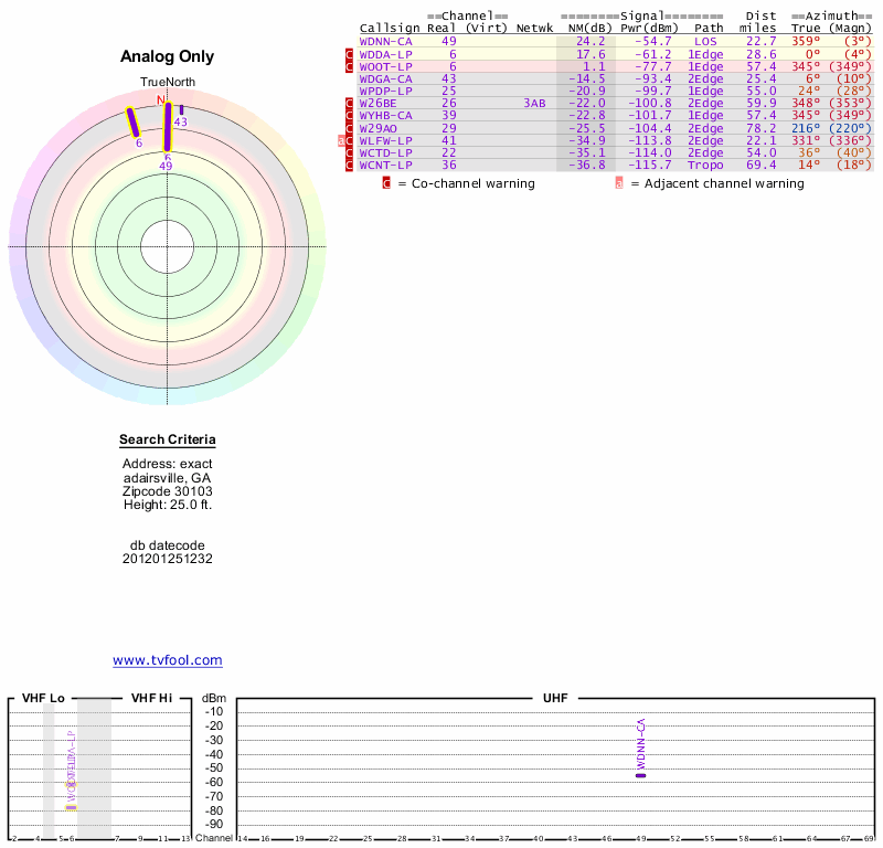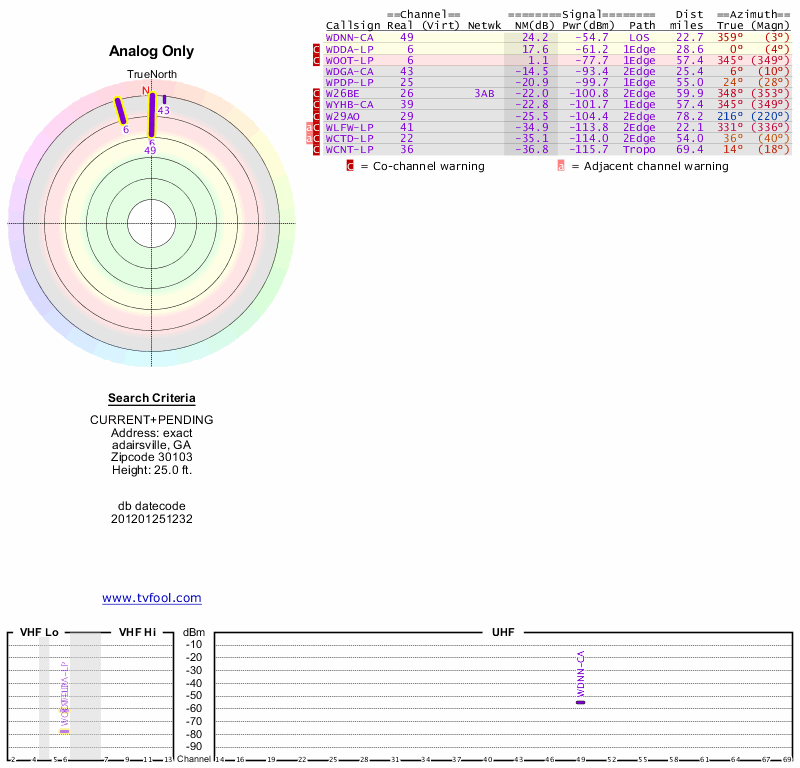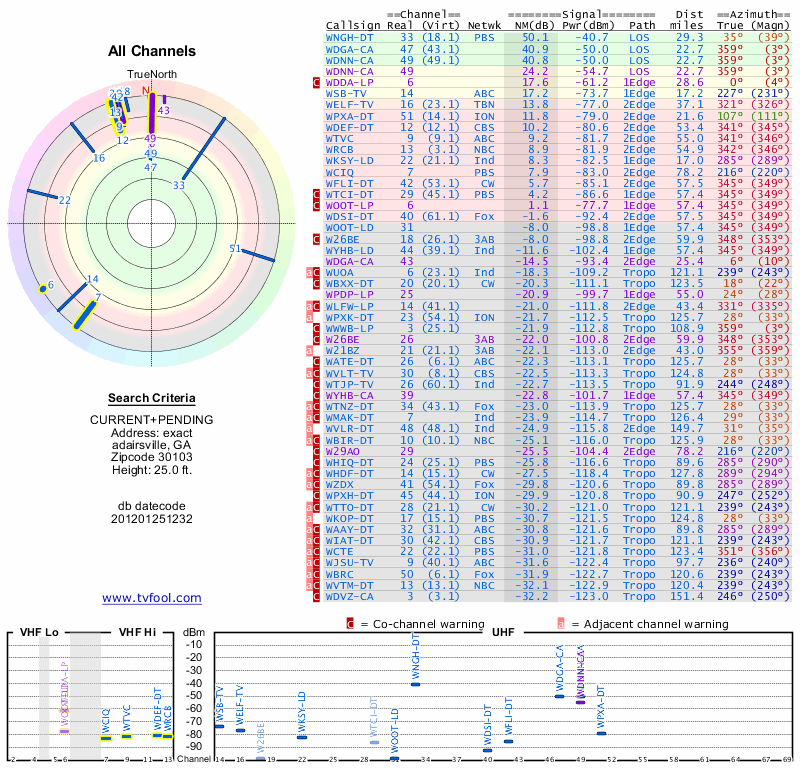 Here are the results for your location. The transmitter database was last updated on June 7, 2013. For more information about these plots and how to interpret them, please check out the Signal Analysis FAQ.
