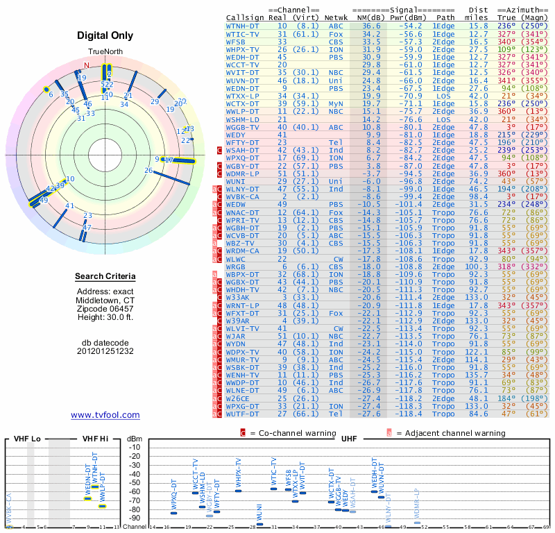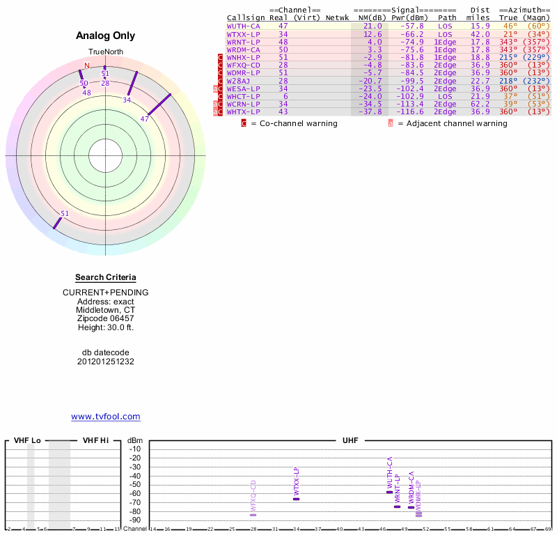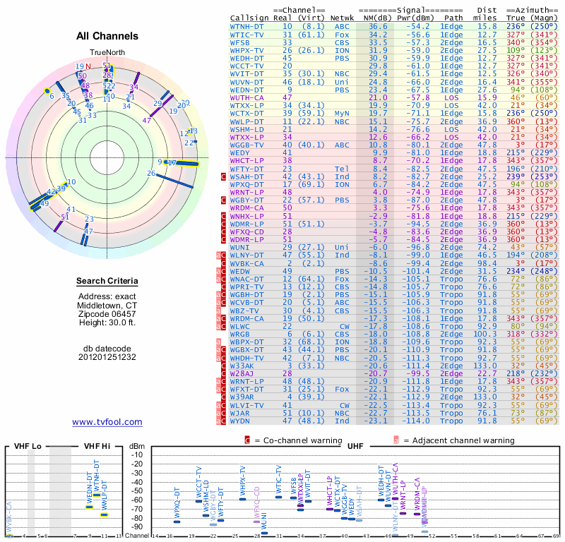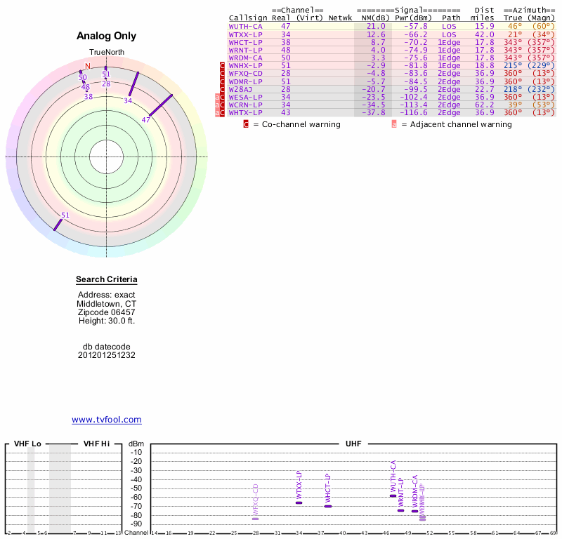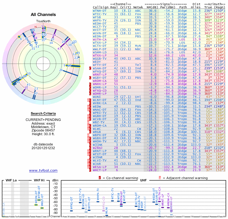 Here are the results for your location. The transmitter database was last updated on June 7, 2013. For more information about these plots and how to interpret them, please check out the Signal Analysis FAQ.