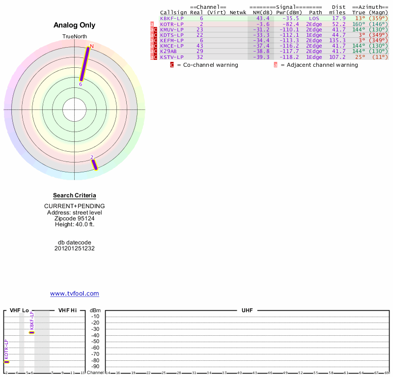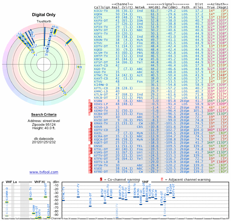 Here are the results for your location. The transmitter database was last updated on June 7, 2013. For more information about these plots and how to interpret them, please check out the Signal Analysis FAQ.