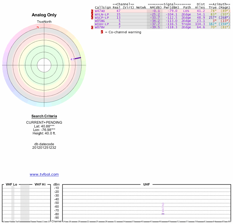 Here are the results for your location. The transmitter database was last updated on June 7, 2013. For more information about these plots and how to interpret them, please check out the Signal Analysis FAQ.