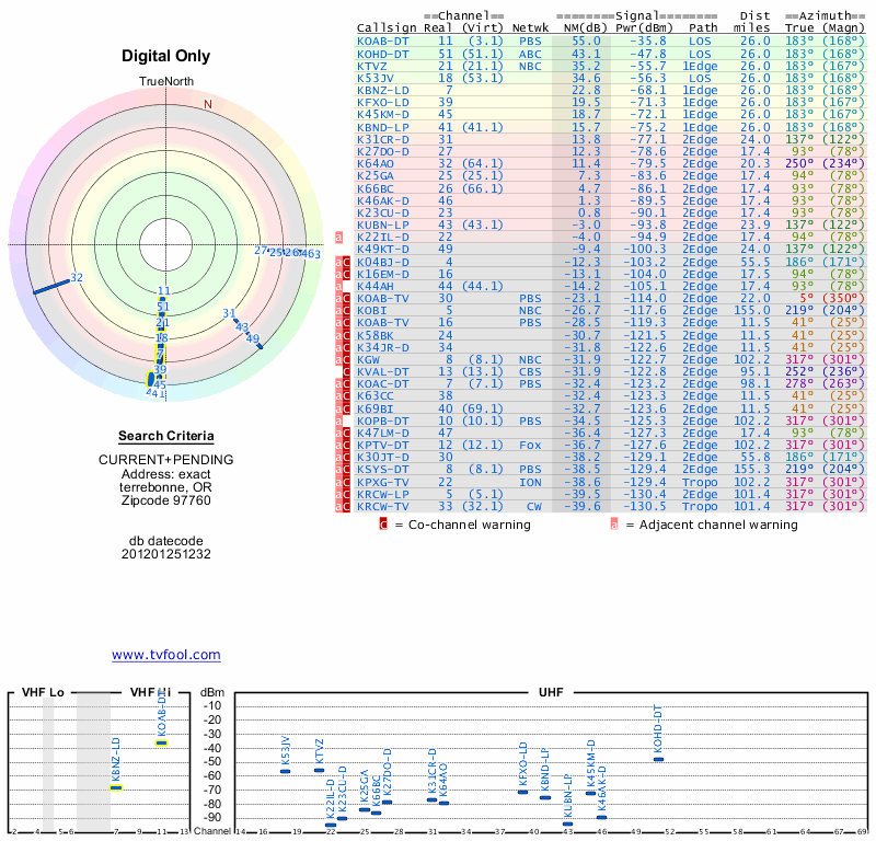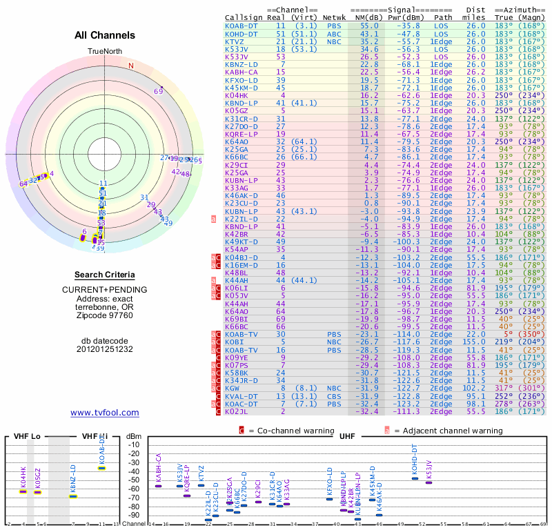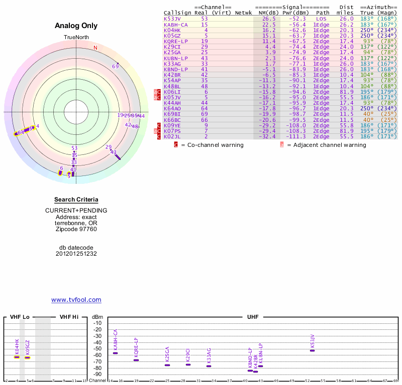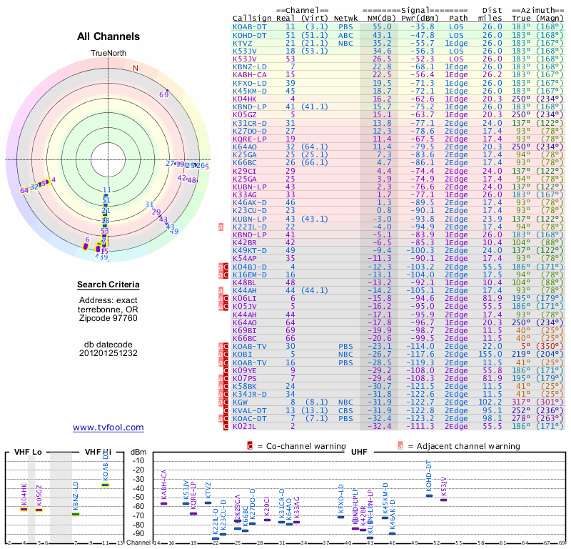Here are the results for your location. The transmitter database was last updated on June 7, 2013. For more information about these plots and how to interpret them, please check out the Signal Analysis FAQ.
