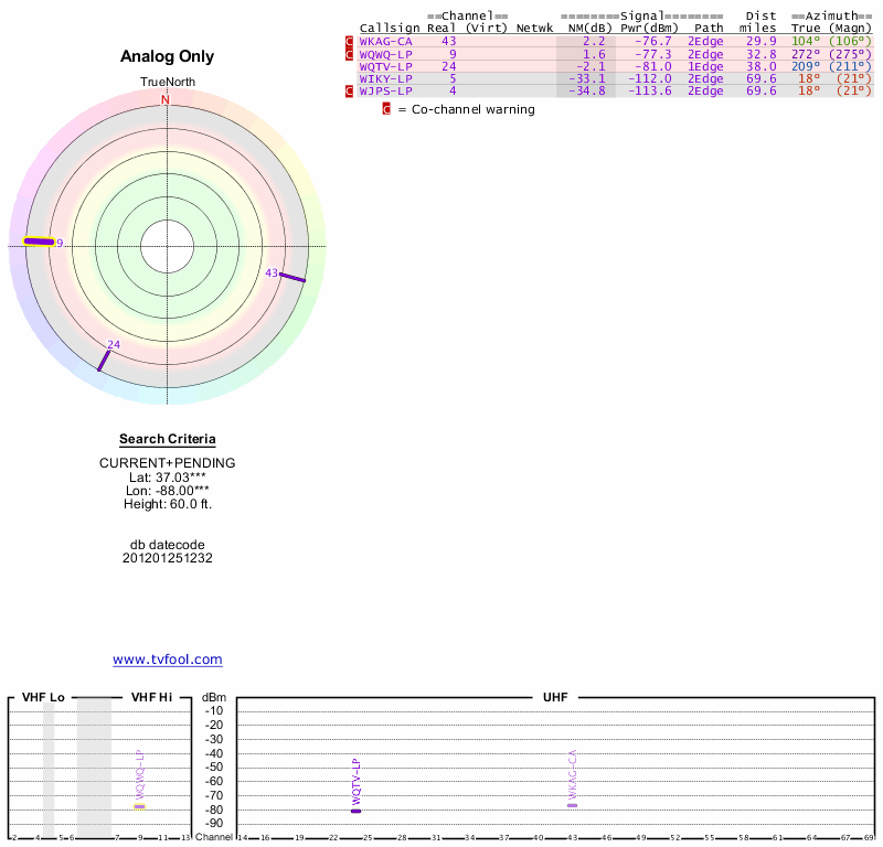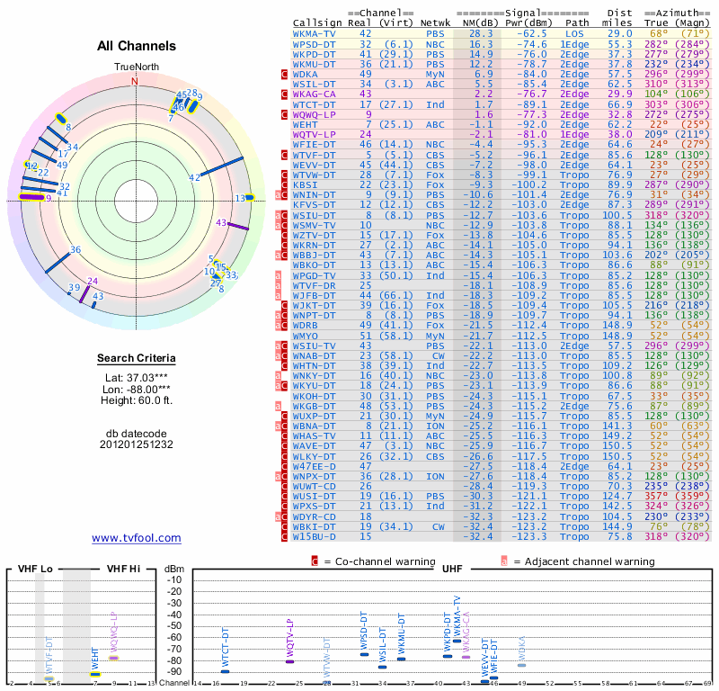 Here are the results for your location. The transmitter database was last updated on June 7, 2013. For more information about these plots and how to interpret them, please check out the Signal Analysis FAQ.