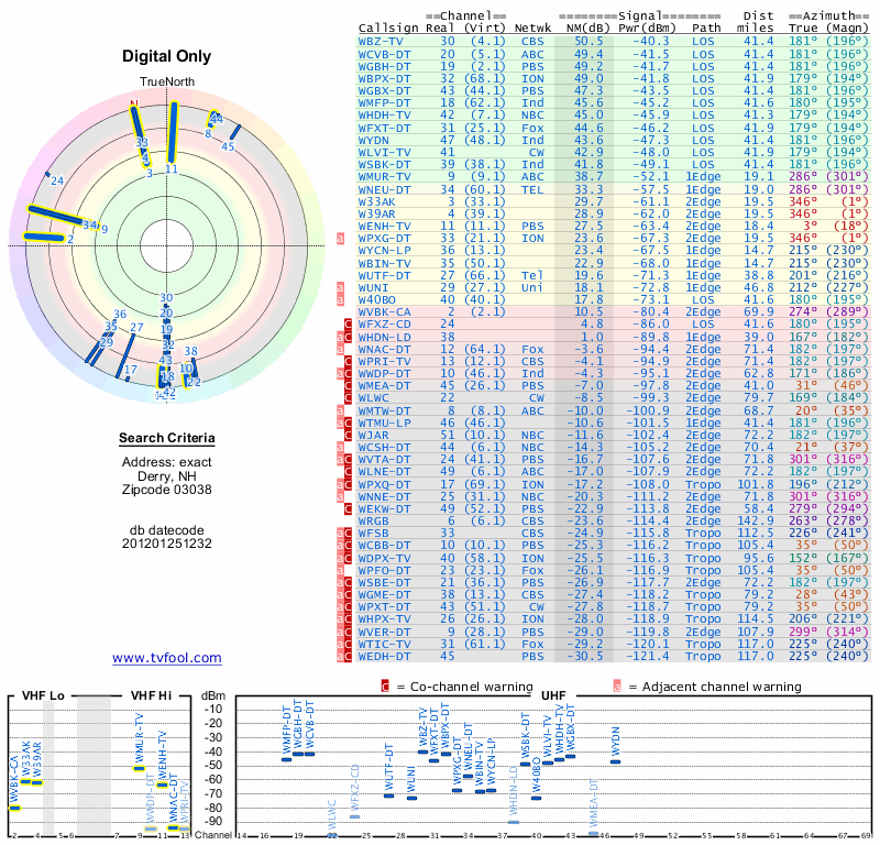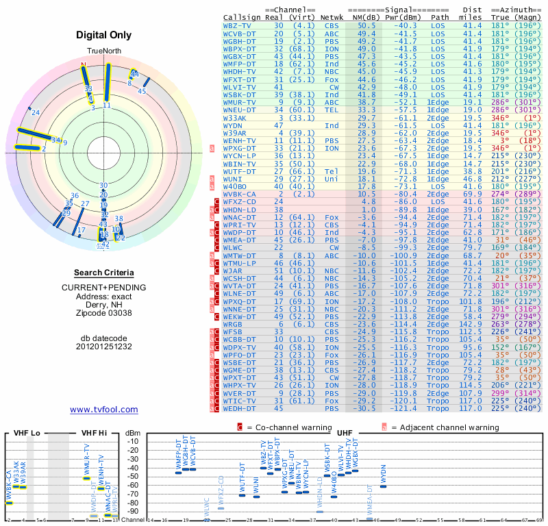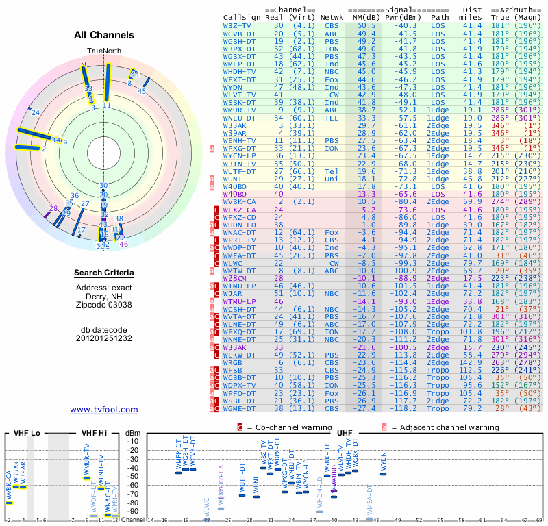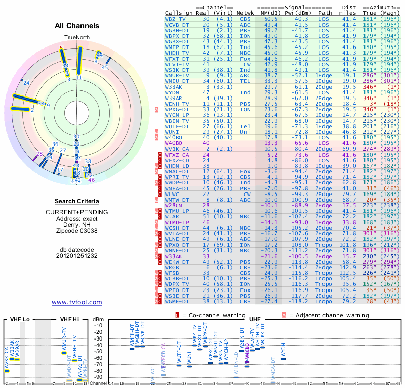 Here are the results for your location. The transmitter database was last updated on June 7, 2013. For more information about these plots and how to interpret them, please check out the Signal Analysis FAQ.