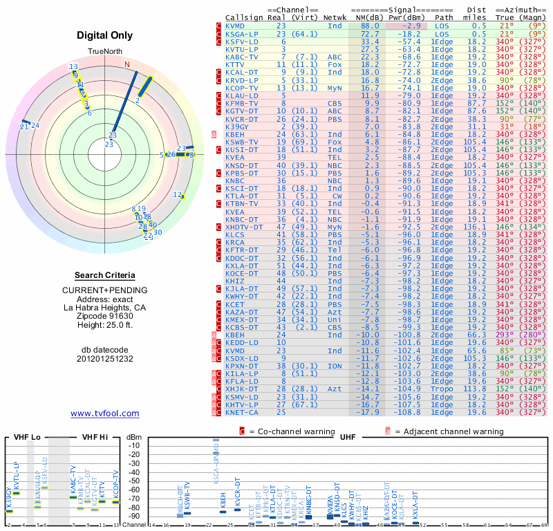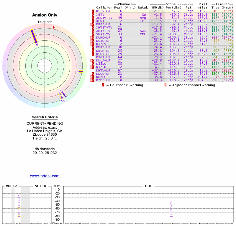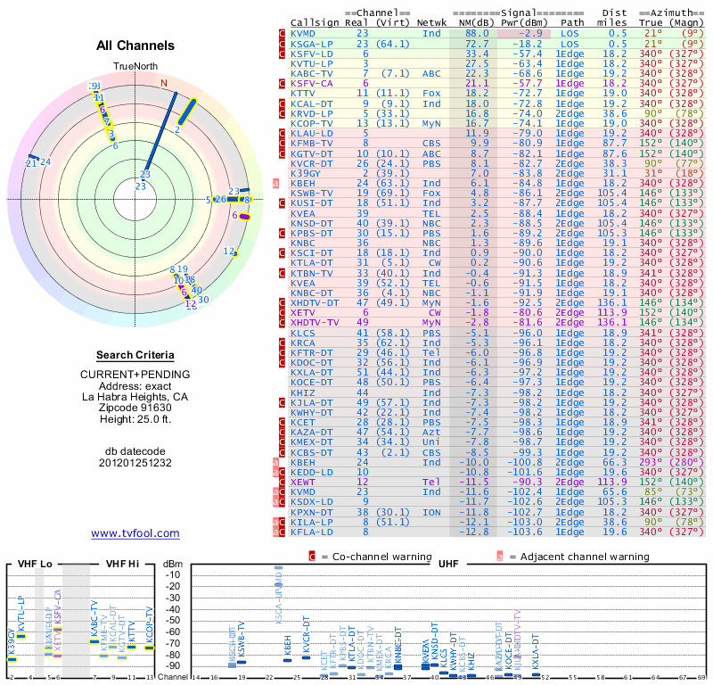 Here are the results for your location. The transmitter database was last updated on June 7, 2013. For more information about these plots and how to interpret them, please check out the Signal Analysis FAQ.