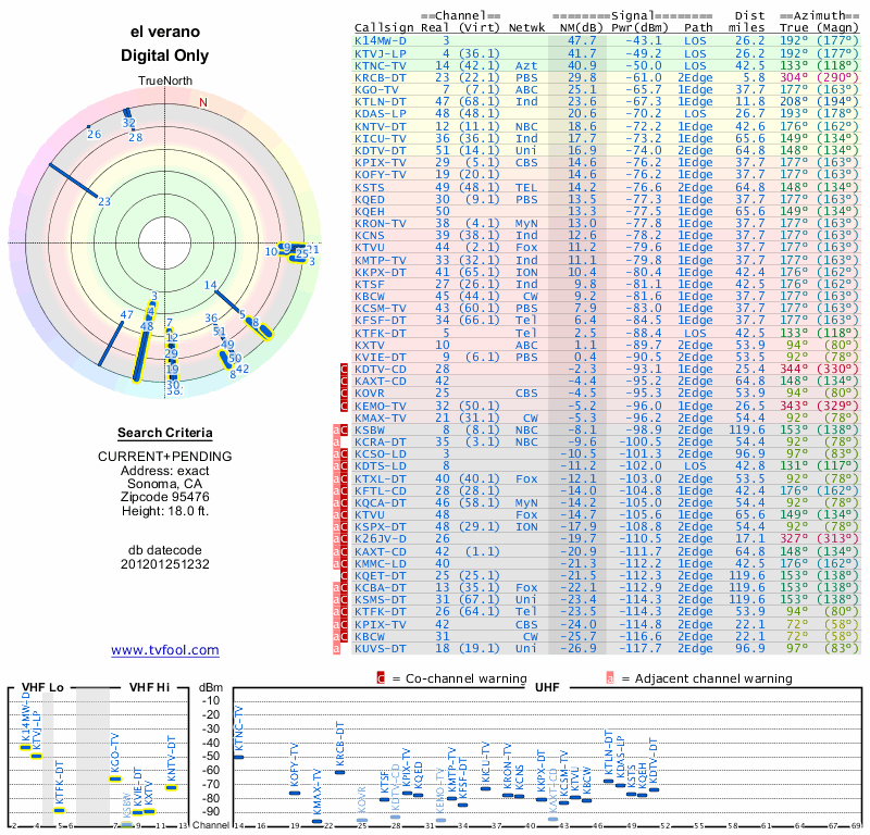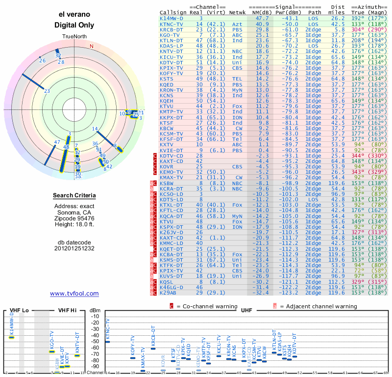 Here are the results for your location. The transmitter database was last updated on June 7, 2013. For more information about these plots and how to interpret them, please check out the Signal Analysis FAQ.