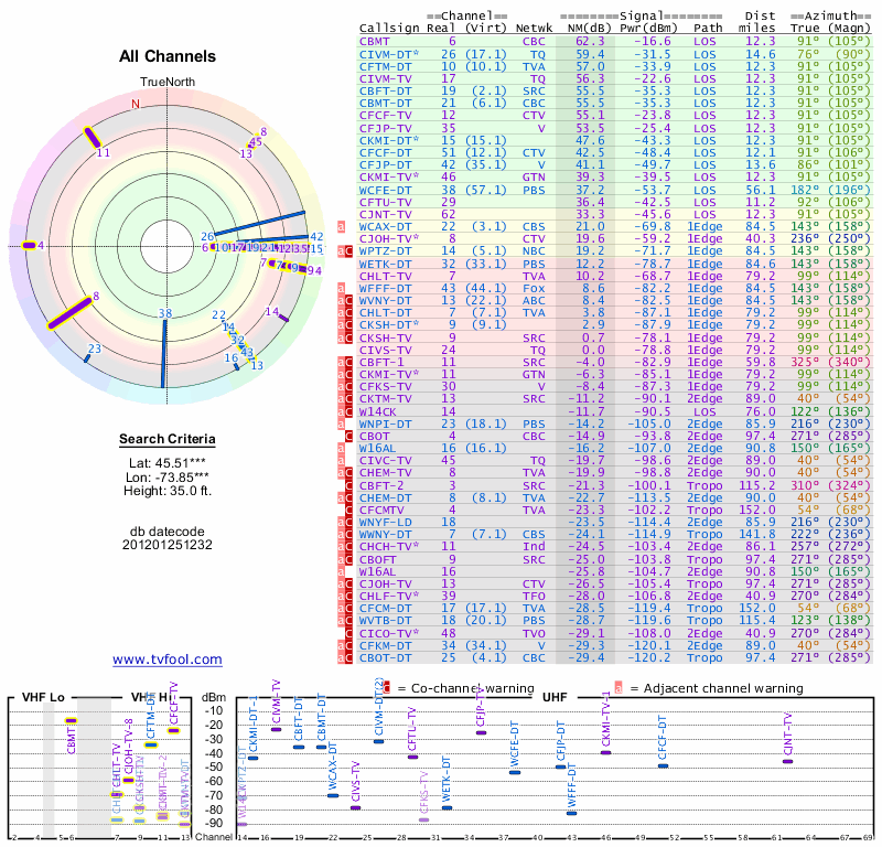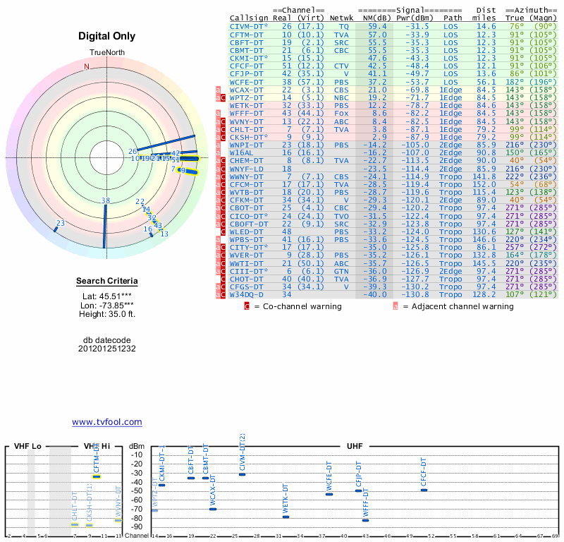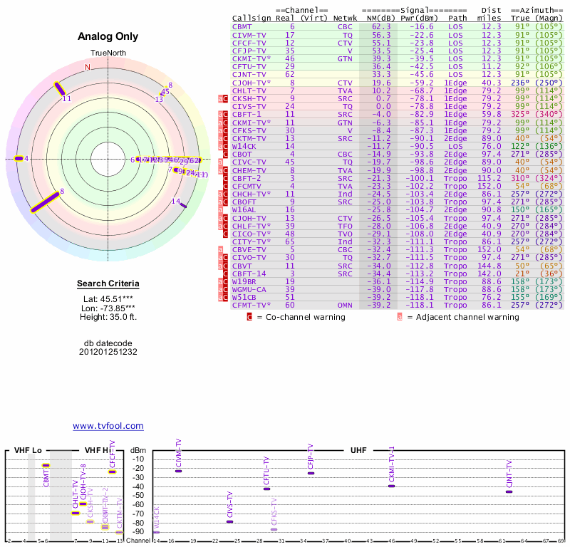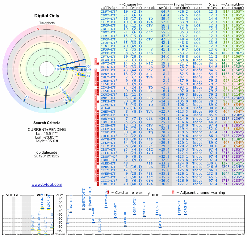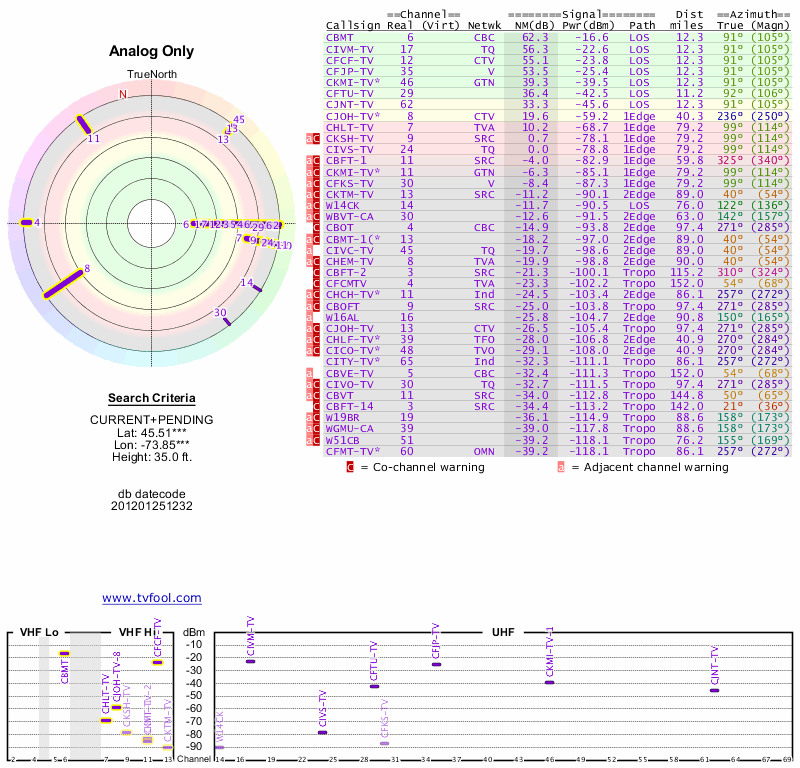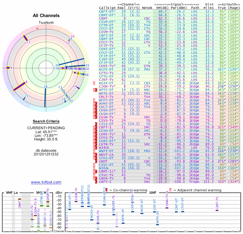 Here are the results for your location. The transmitter database was last updated on June 7, 2013. For more information about these plots and how to interpret them, please check out the Signal Analysis FAQ.