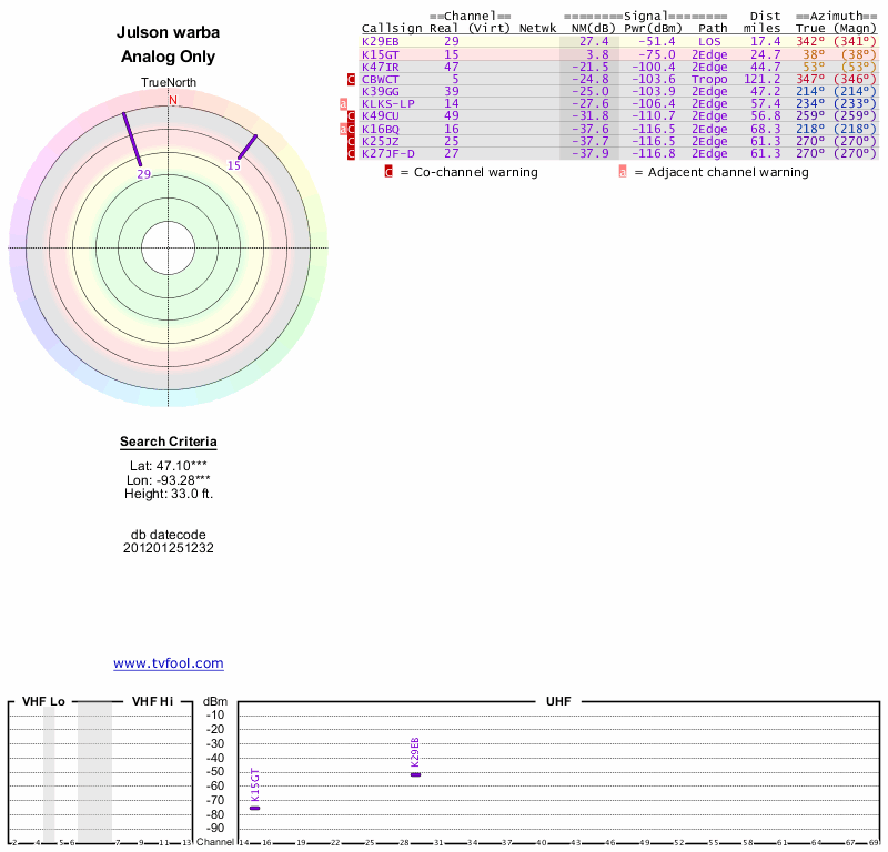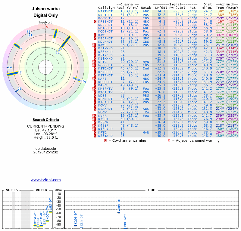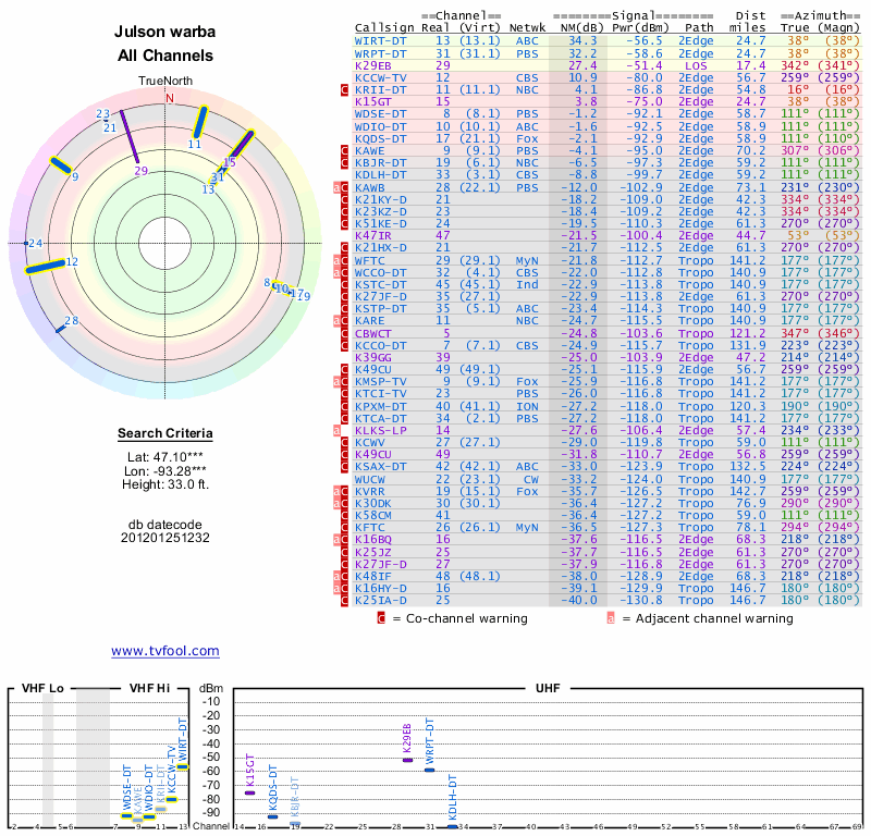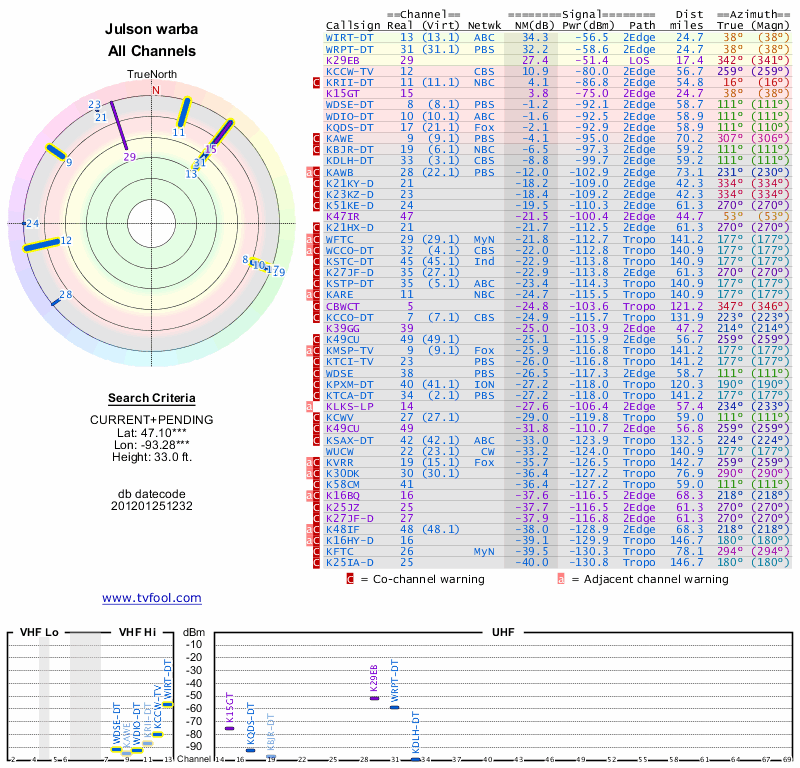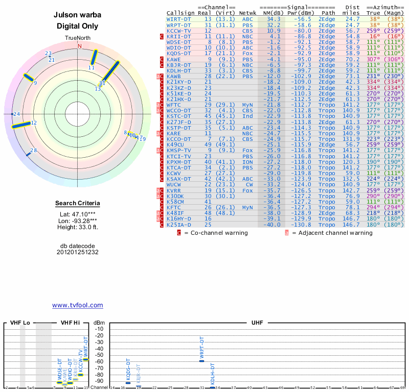 Here are the results for your location. The transmitter database was last updated on June 7, 2013. For more information about these plots and how to interpret them, please check out the Signal Analysis FAQ.