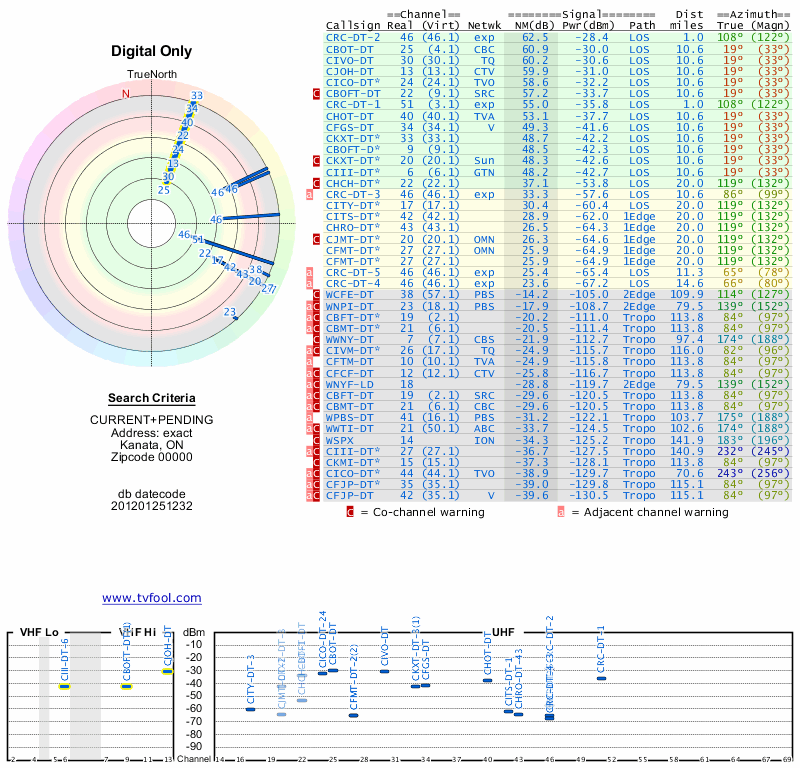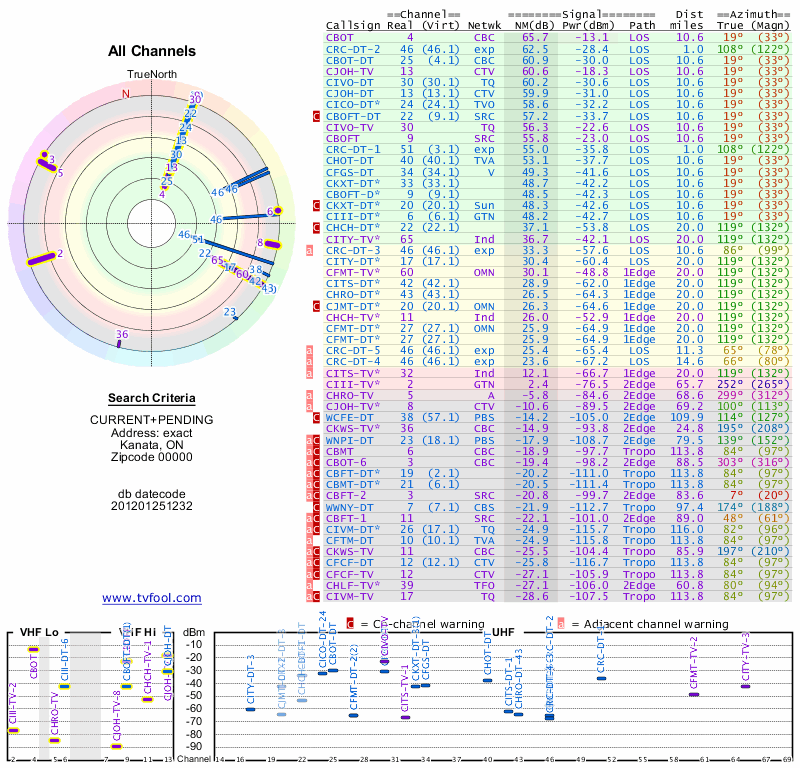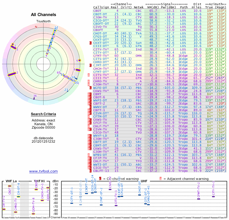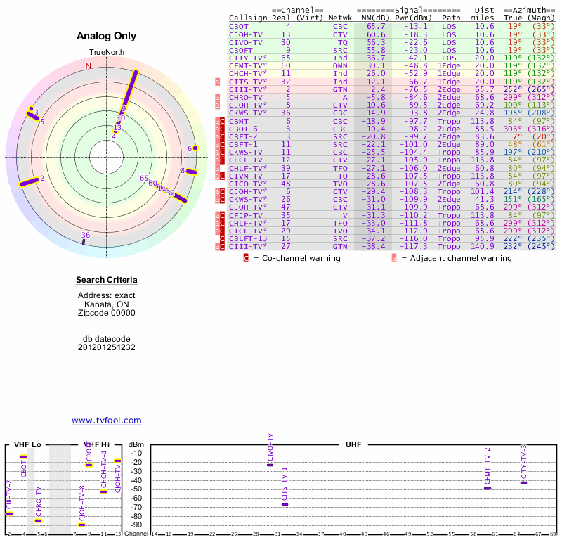 Here are the results for your location. The transmitter database was last updated on June 7, 2013. For more information about these plots and how to interpret them, please check out the Signal Analysis FAQ.