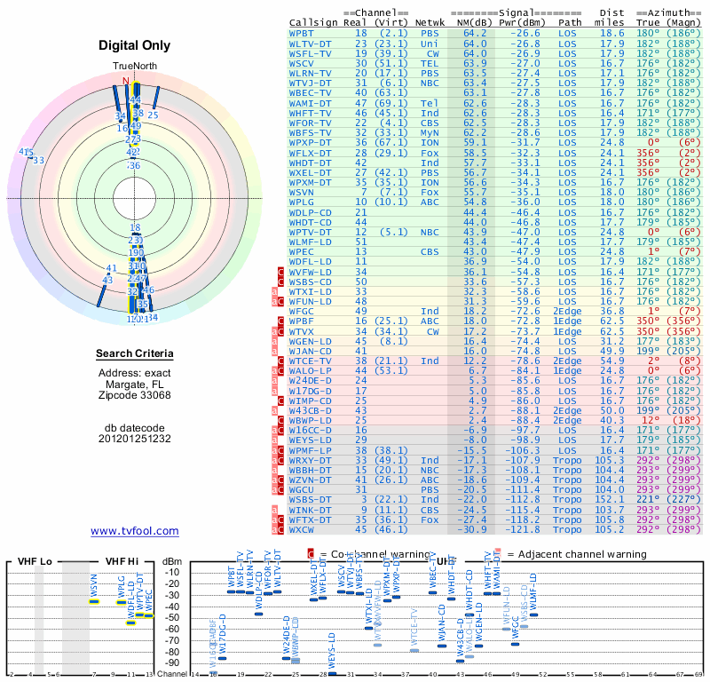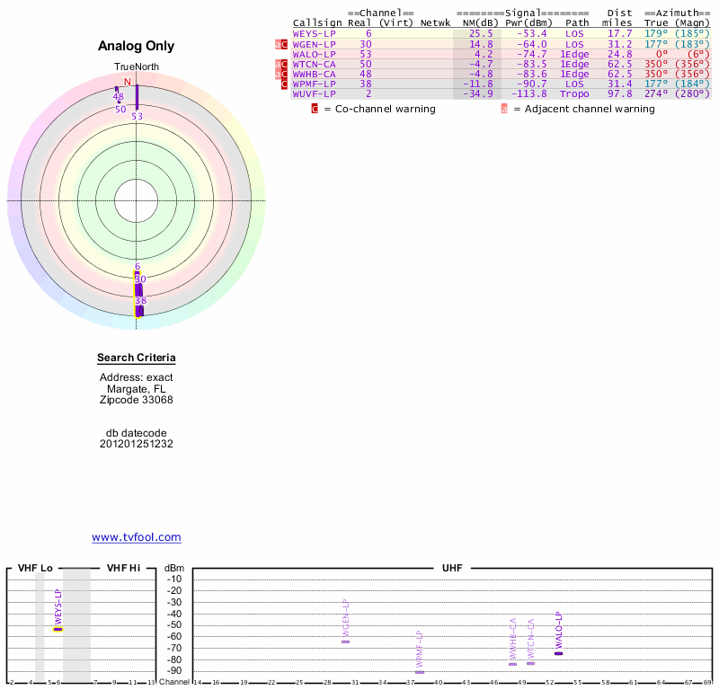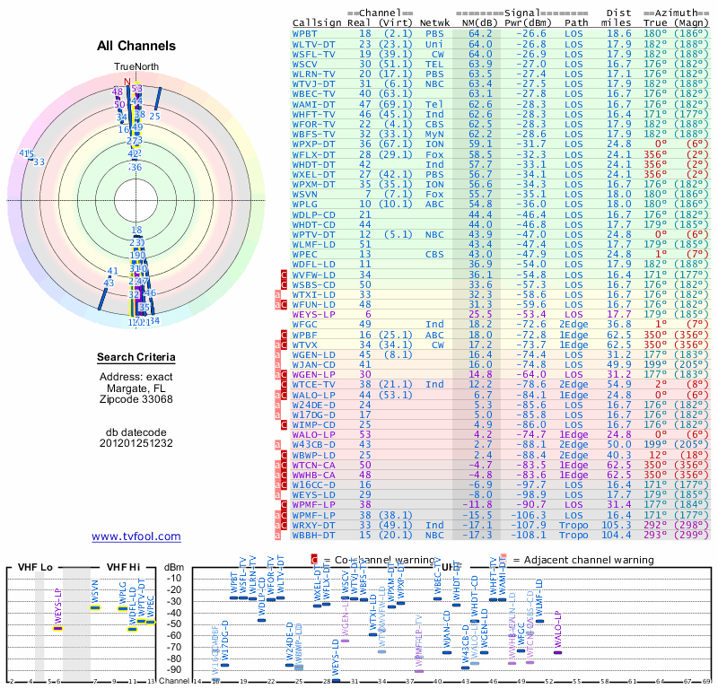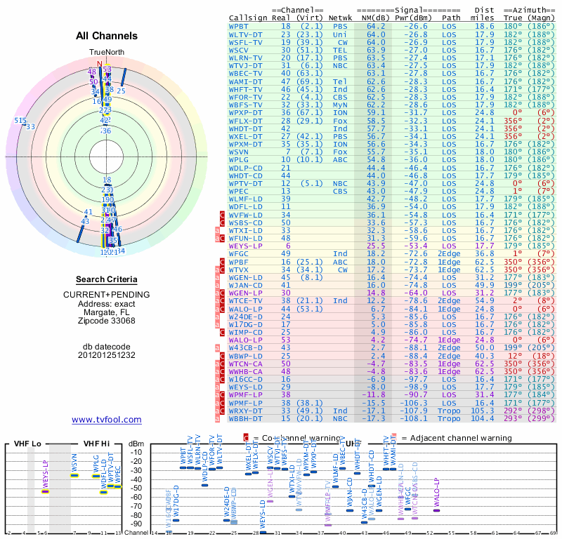 Here are the results for your location. The transmitter database was last updated on June 7, 2013. For more information about these plots and how to interpret them, please check out the Signal Analysis FAQ.