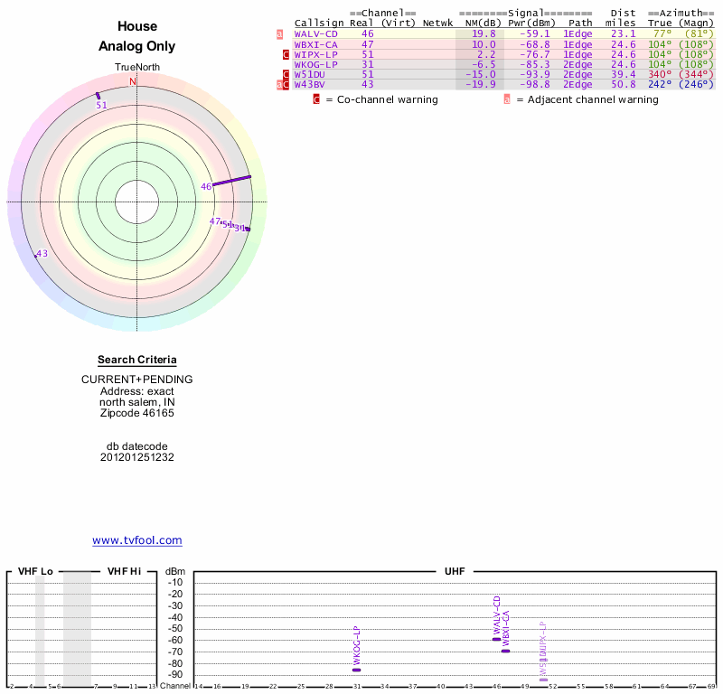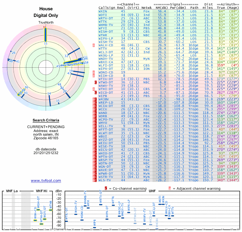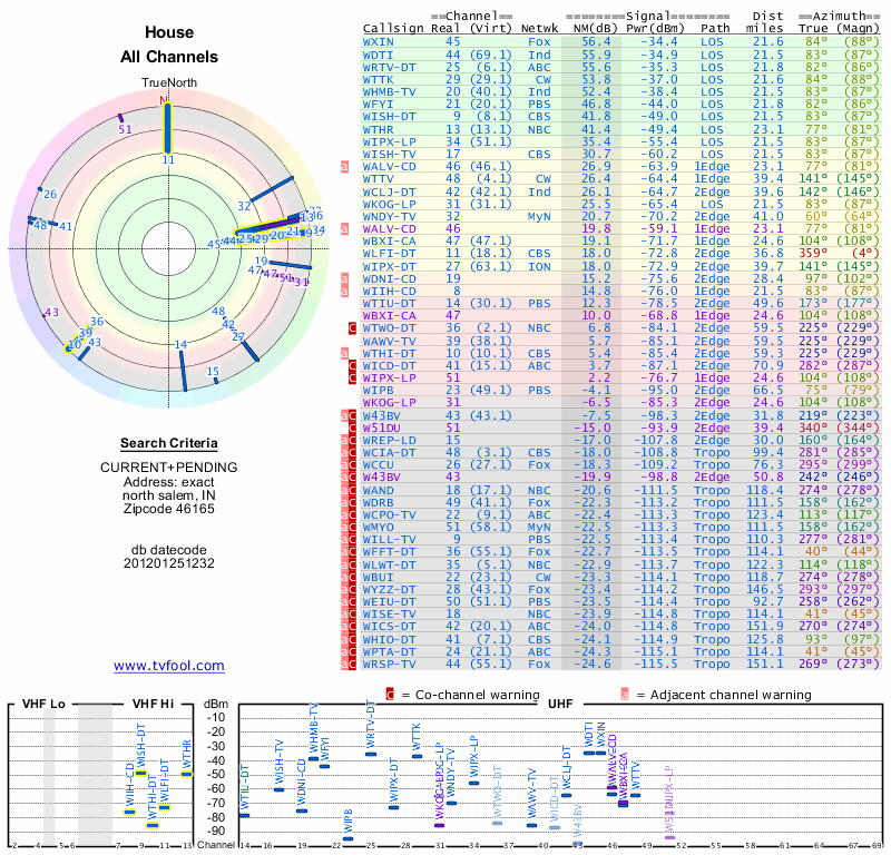 Here are the results for your location. The transmitter database was last updated on June 7, 2013. For more information about these plots and how to interpret them, please check out the Signal Analysis FAQ.
