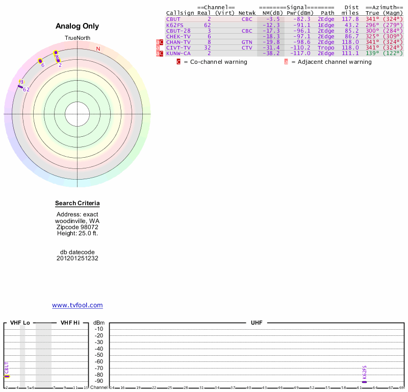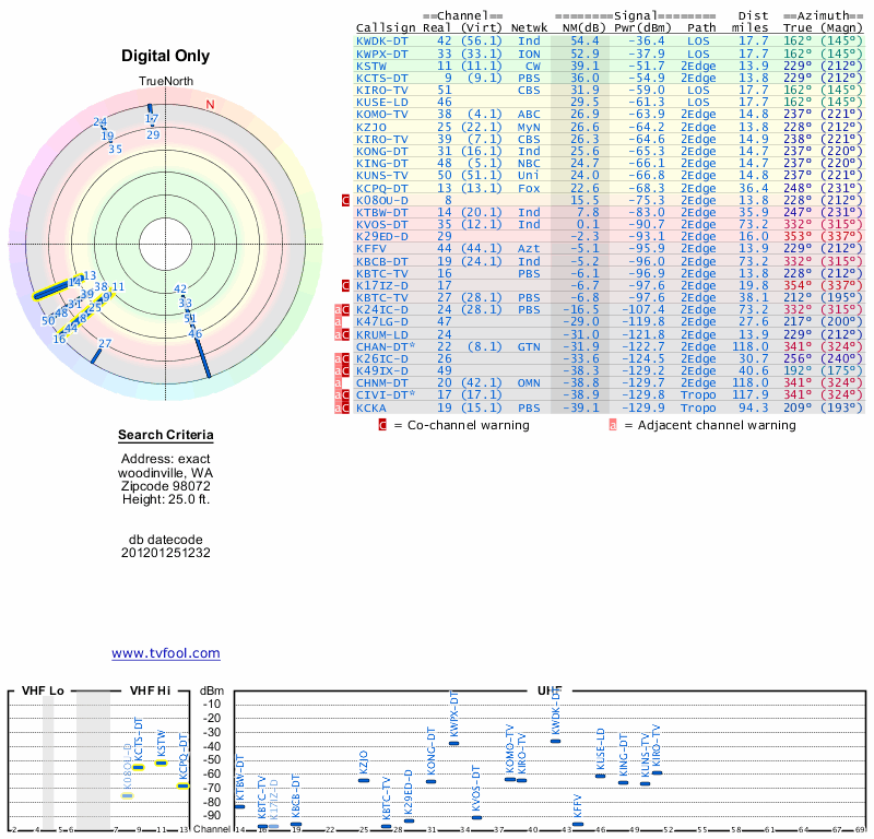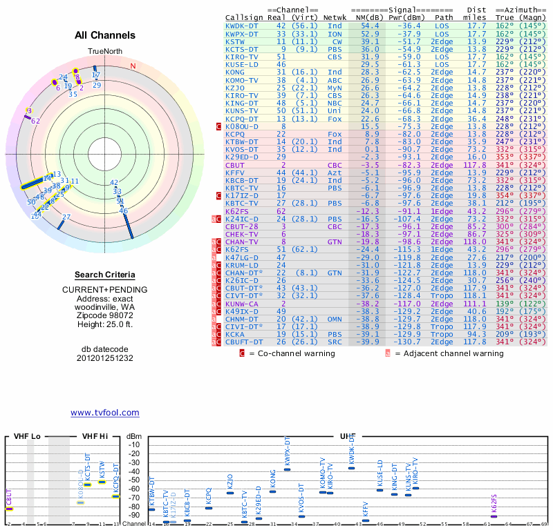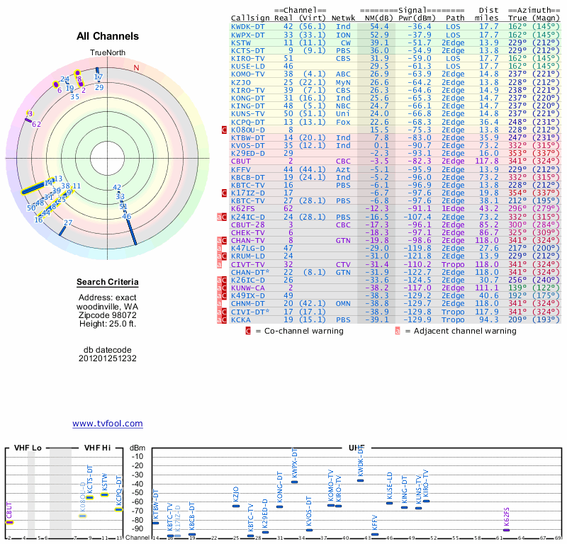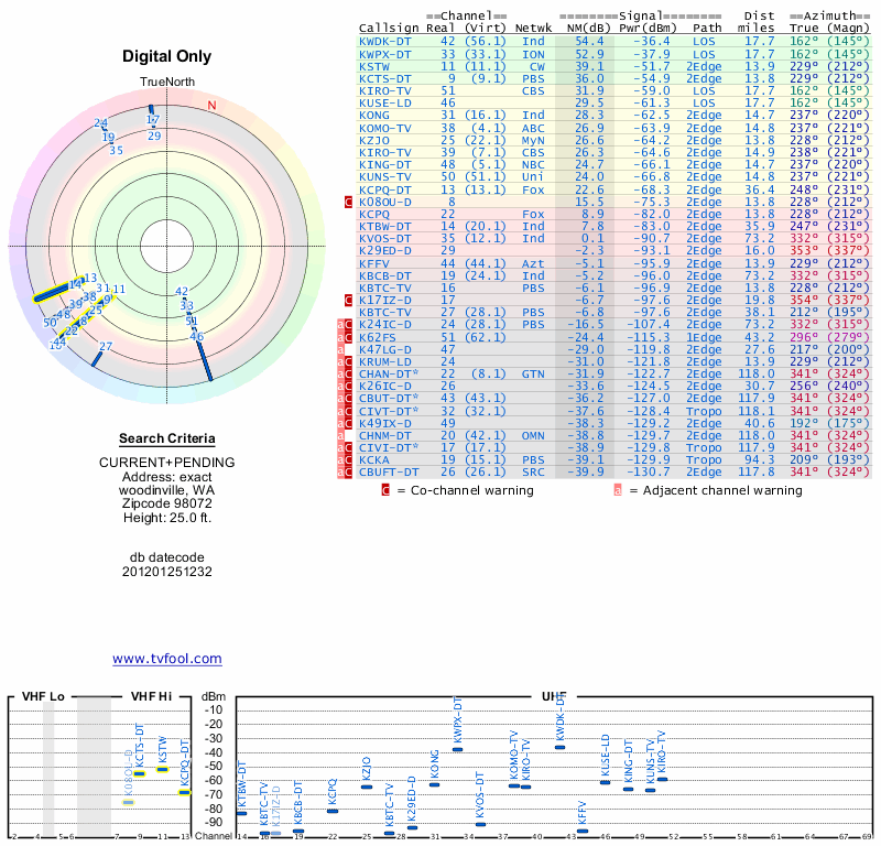 Here are the results for your location. The transmitter database was last updated on June 7, 2013. For more information about these plots and how to interpret them, please check out the Signal Analysis FAQ.