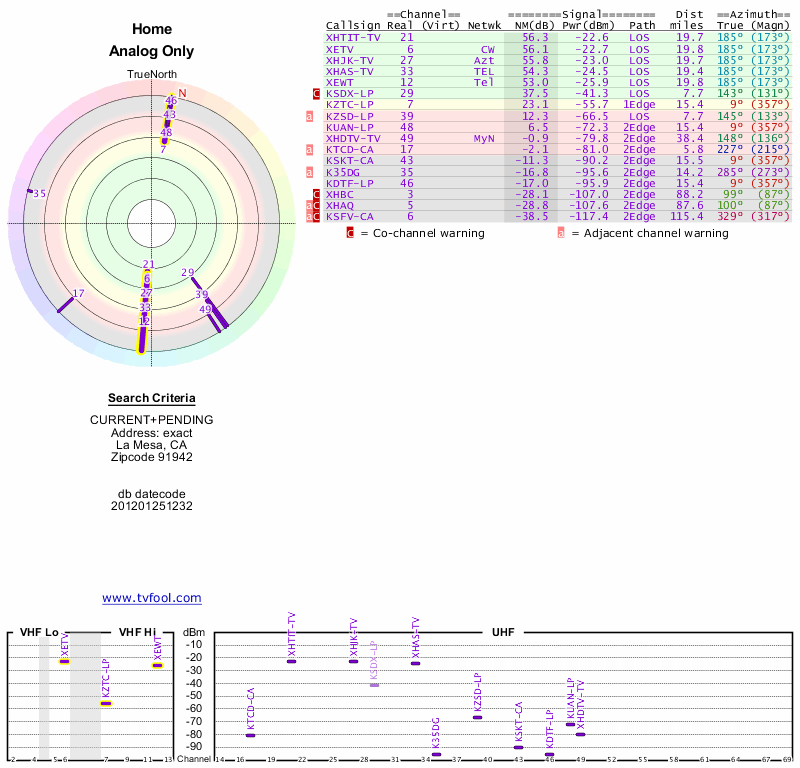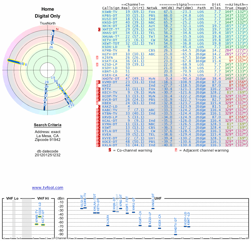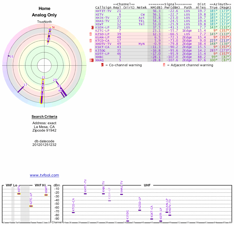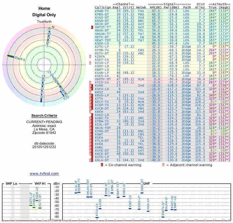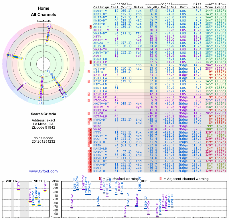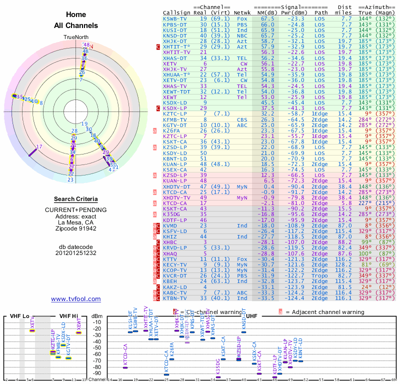 Here are the results for your location. The transmitter database was last updated on June 7, 2013. For more information about these plots and how to interpret them, please check out the Signal Analysis FAQ.