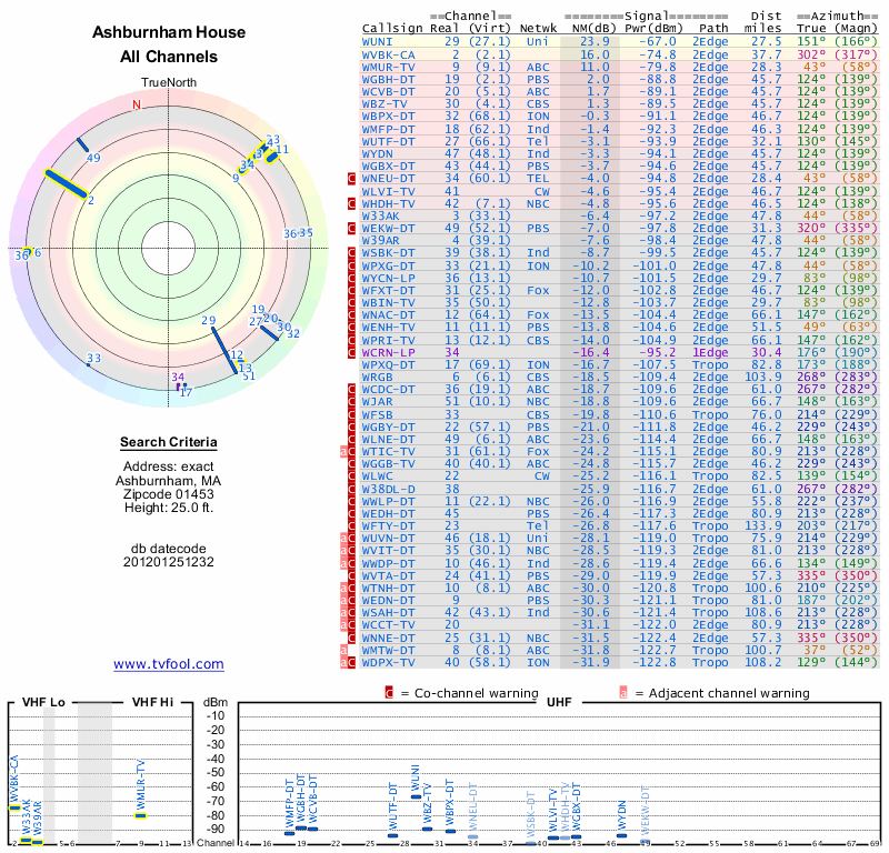 Here are the results for your location. The transmitter database was last updated on June 7, 2013. For more information about these plots and how to interpret them, please check out the Signal Analysis FAQ.