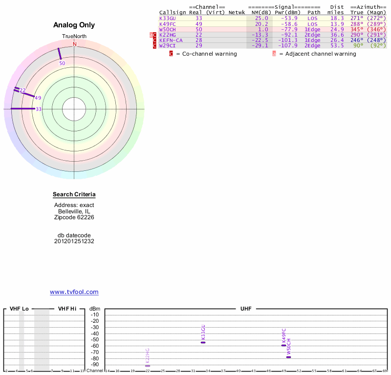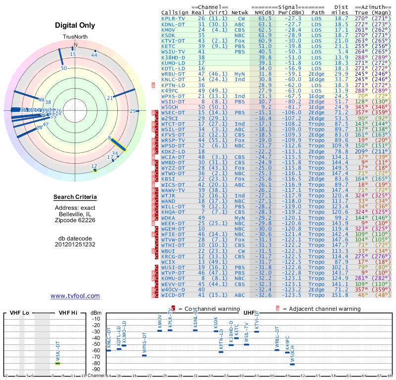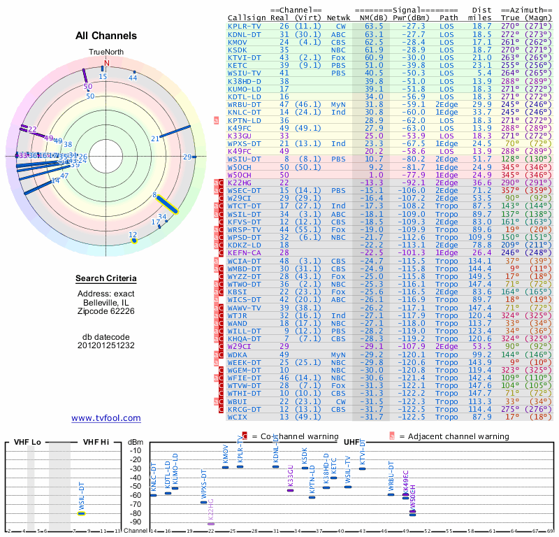 Here are the results for your location. The transmitter database was last updated on June 7, 2013. For more information about these plots and how to interpret them, please check out the Signal Analysis FAQ.