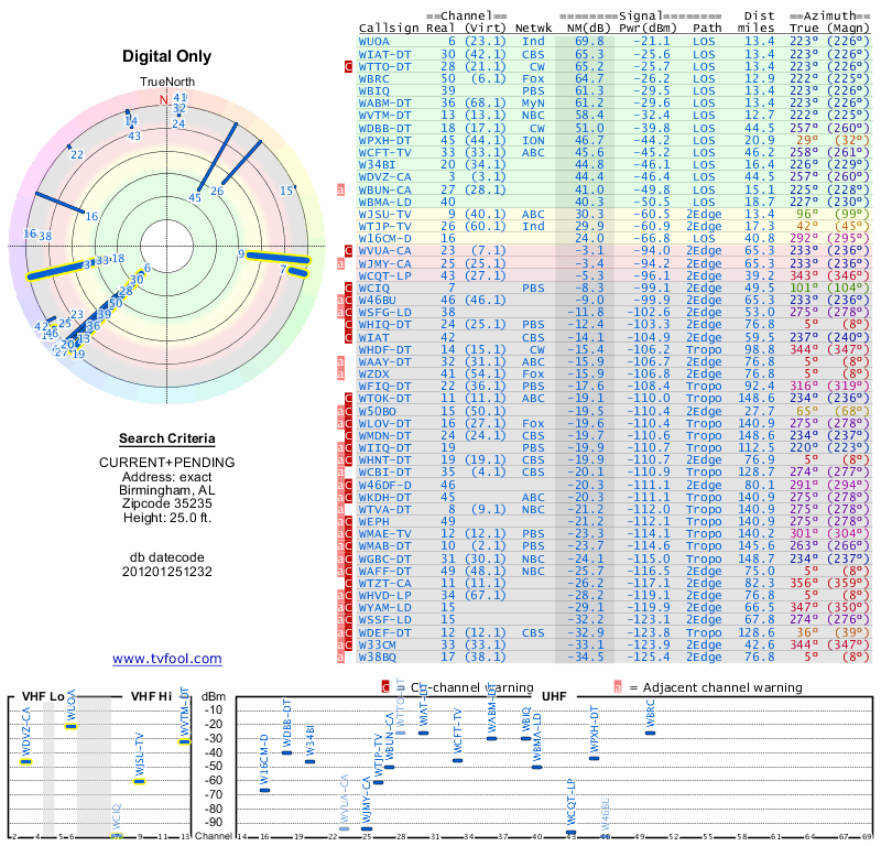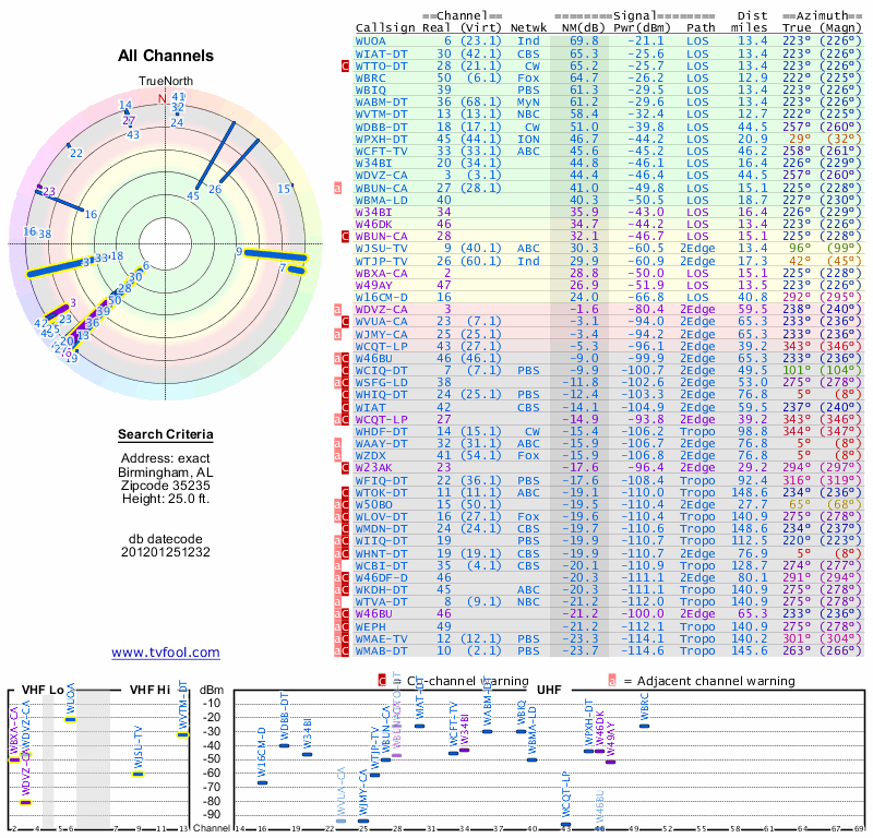 Here are the results for your location. The transmitter database was last updated on June 7, 2013. For more information about these plots and how to interpret them, please check out the Signal Analysis FAQ.