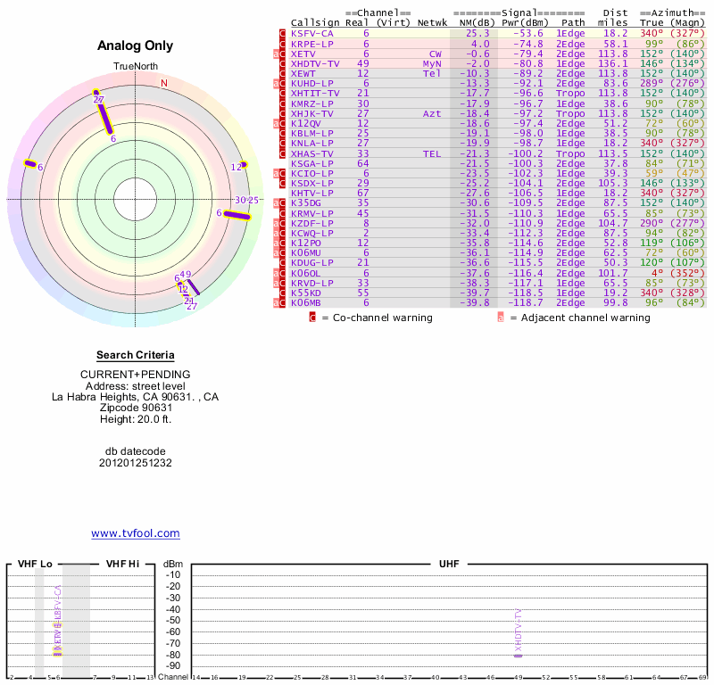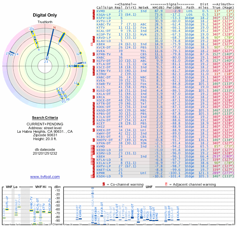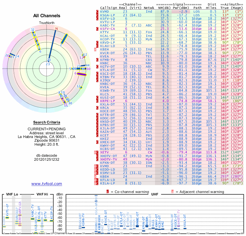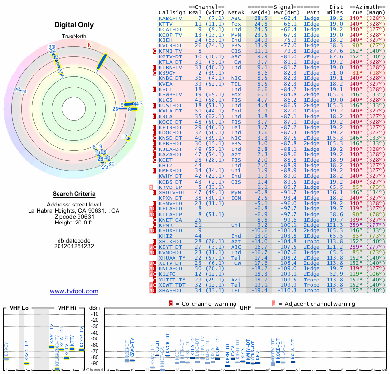 Here are the results for your location. The transmitter database was last updated on June 7, 2013. For more information about these plots and how to interpret them, please check out the Signal Analysis FAQ.