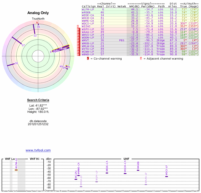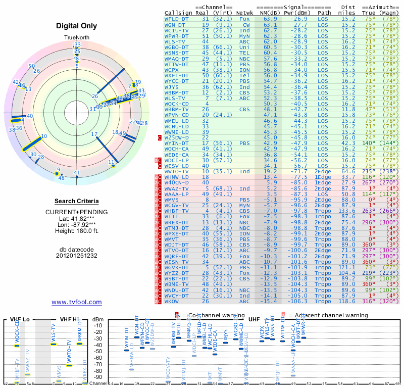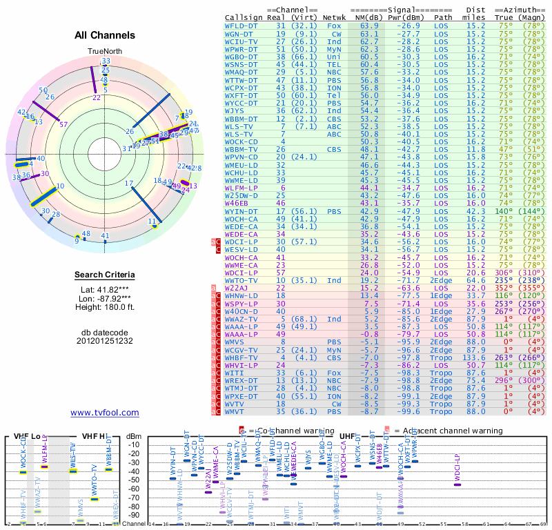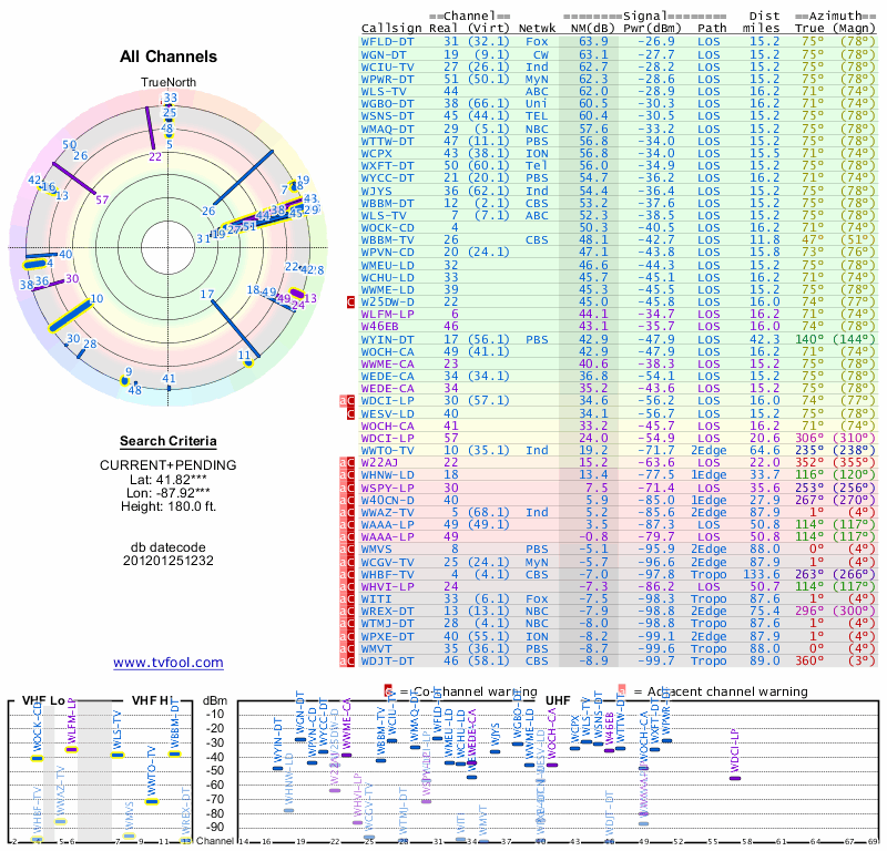Here are the results for your location. The transmitter database was last updated on June 7, 2013. For more information about these plots and how to interpret them, please check out the Signal Analysis FAQ.
