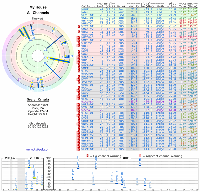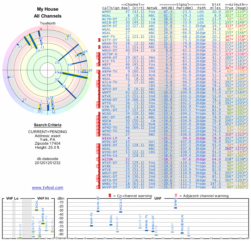 Here are the results for your location. The transmitter database was last updated on June 7, 2013. For more information about these plots and how to interpret them, please check out the Signal Analysis FAQ.