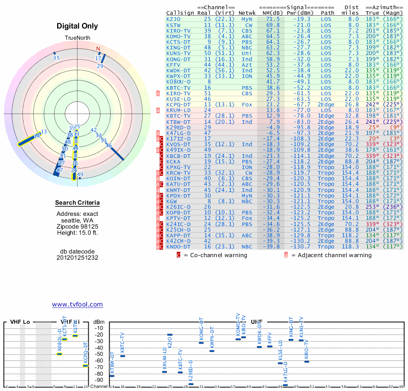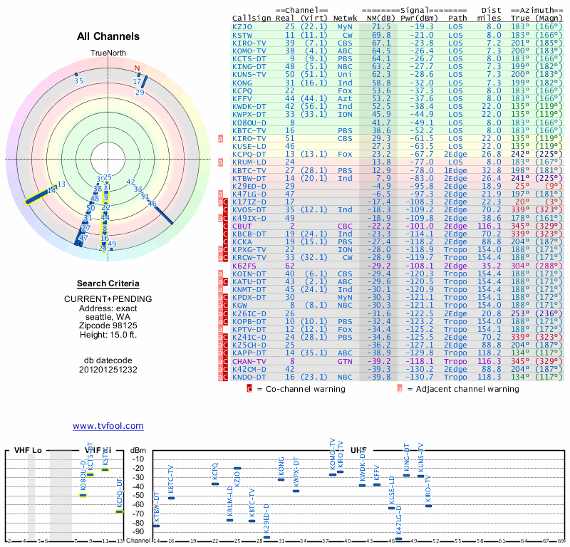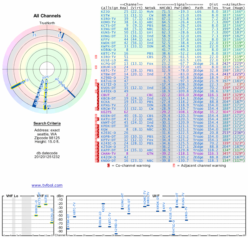 Here are the results for your location. The transmitter database was last updated on June 7, 2013. For more information about these plots and how to interpret them, please check out the Signal Analysis FAQ.