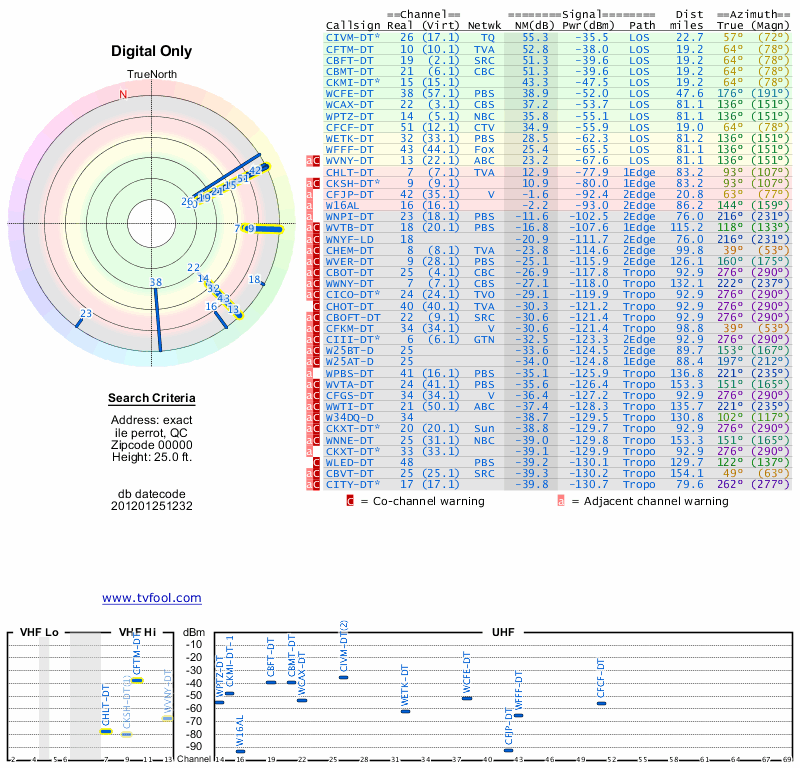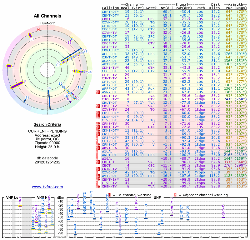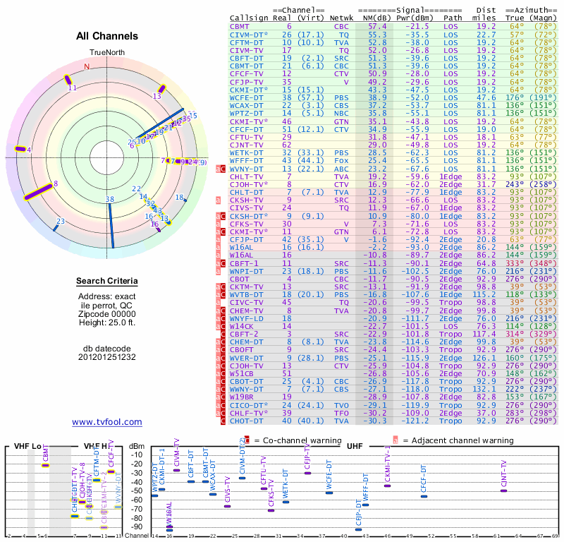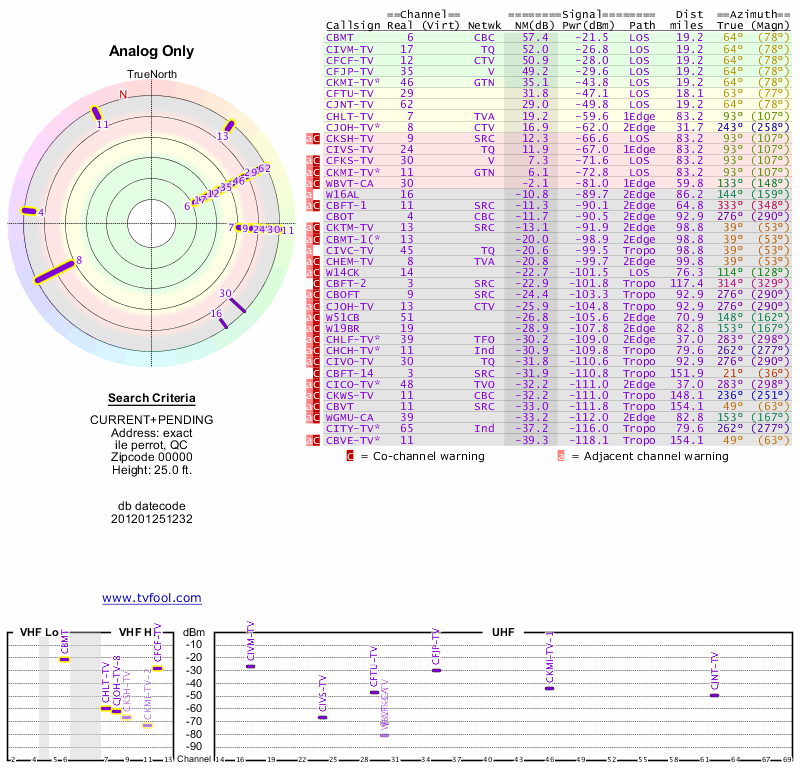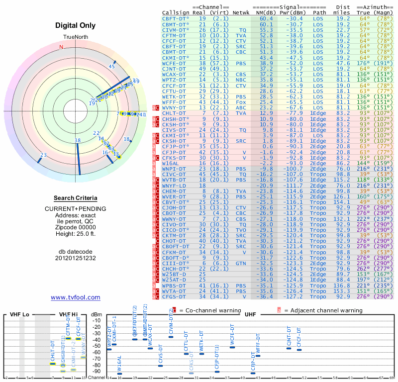 Here are the results for your location. The transmitter database was last updated on June 7, 2013. For more information about these plots and how to interpret them, please check out the Signal Analysis FAQ.