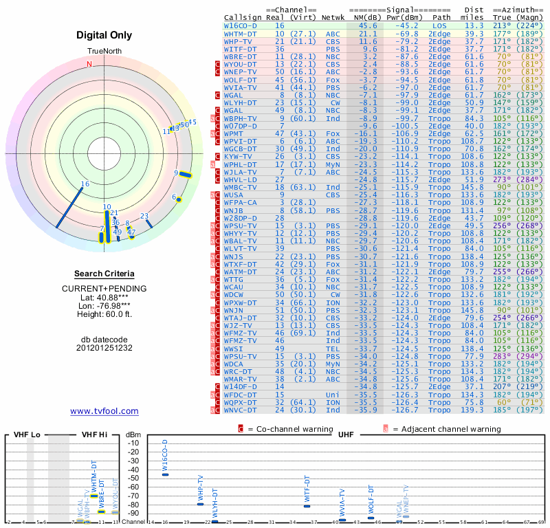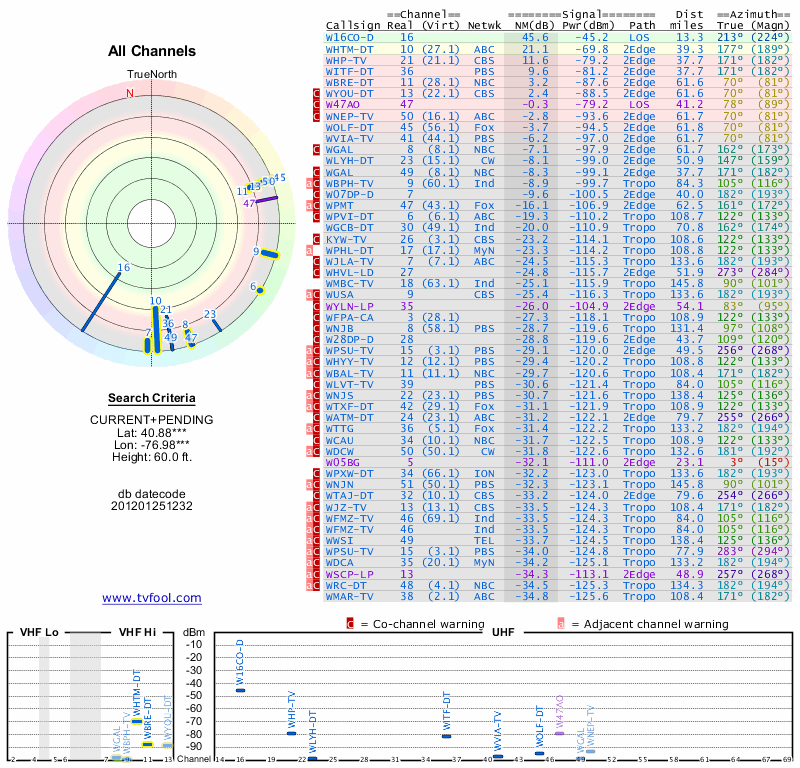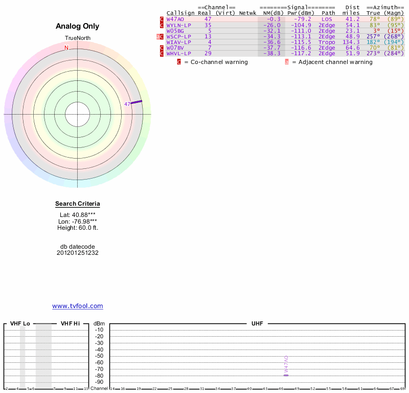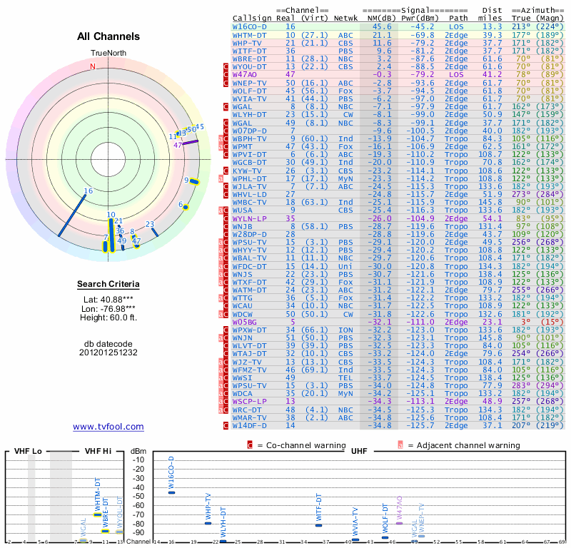 Here are the results for your location. The transmitter database was last updated on June 7, 2013. For more information about these plots and how to interpret them, please check out the Signal Analysis FAQ.