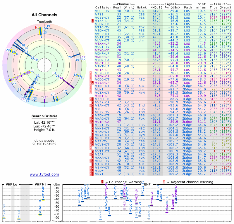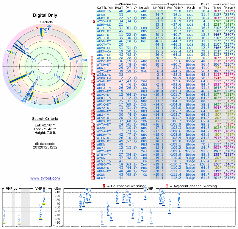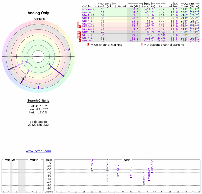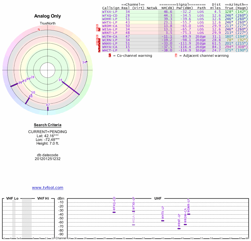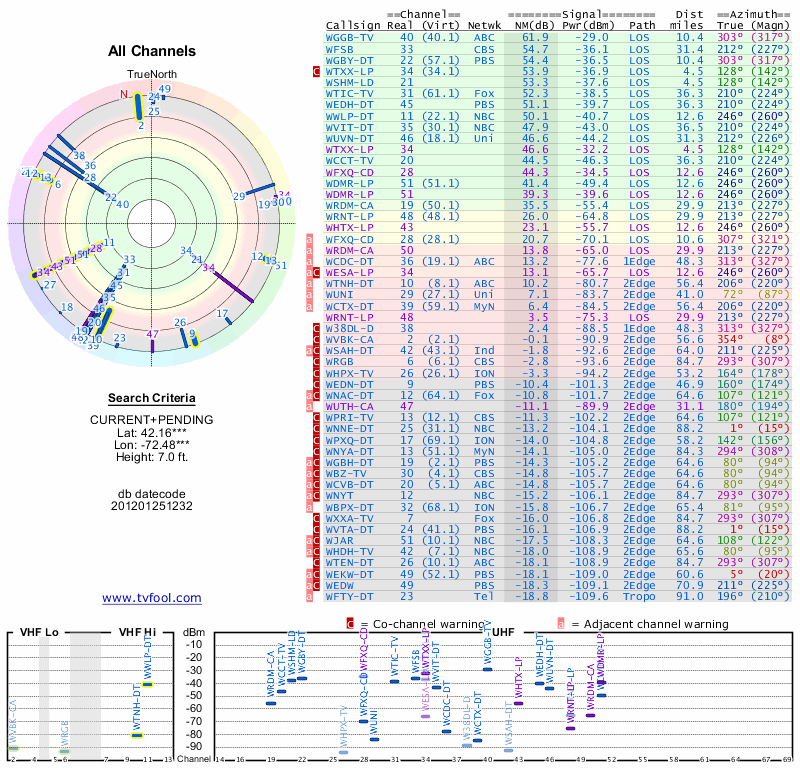 Here are the results for your location. The transmitter database was last updated on June 7, 2013. For more information about these plots and how to interpret them, please check out the Signal Analysis FAQ.