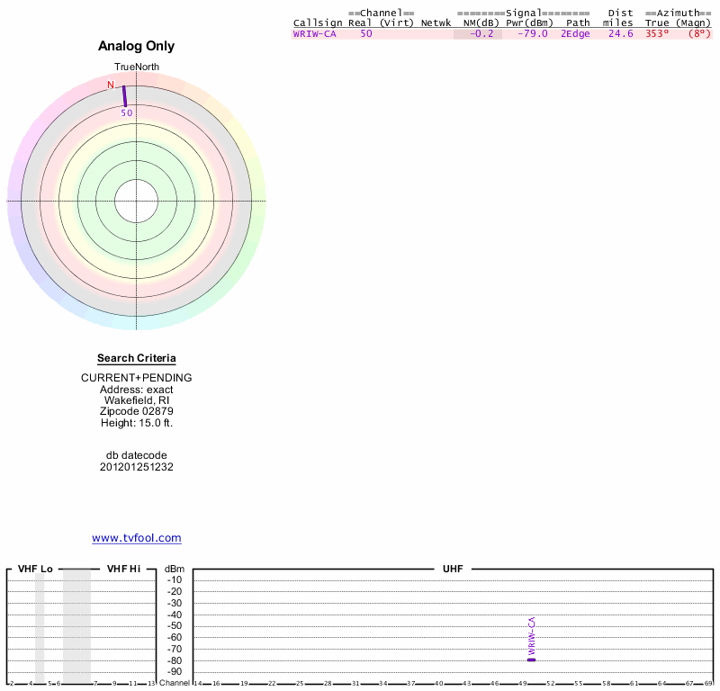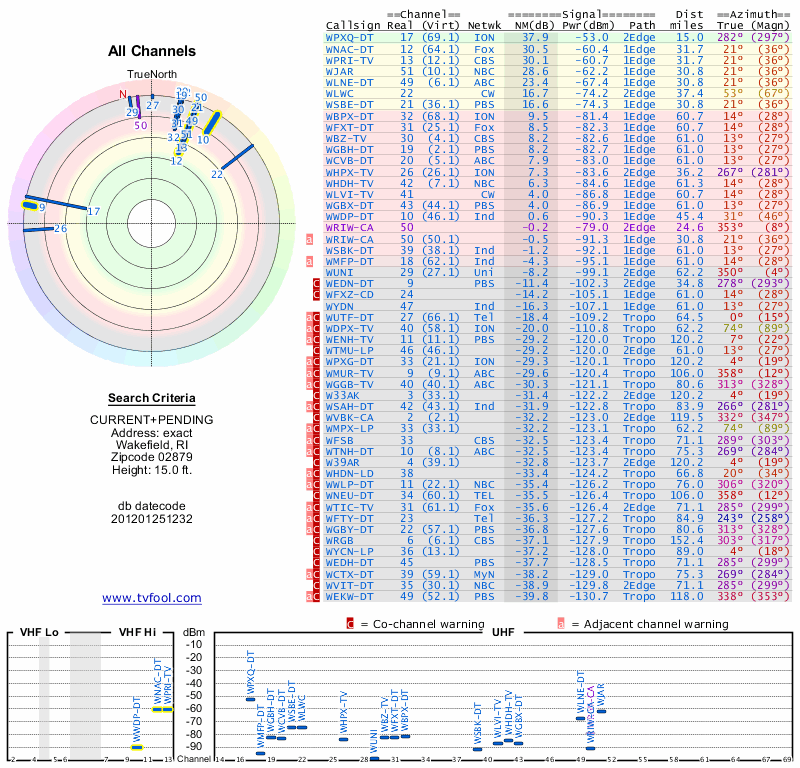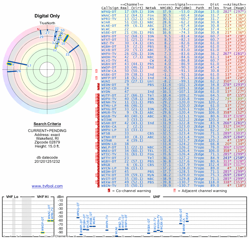 Here are the results for your location. The transmitter database was last updated on June 7, 2013. For more information about these plots and how to interpret them, please check out the Signal Analysis FAQ.