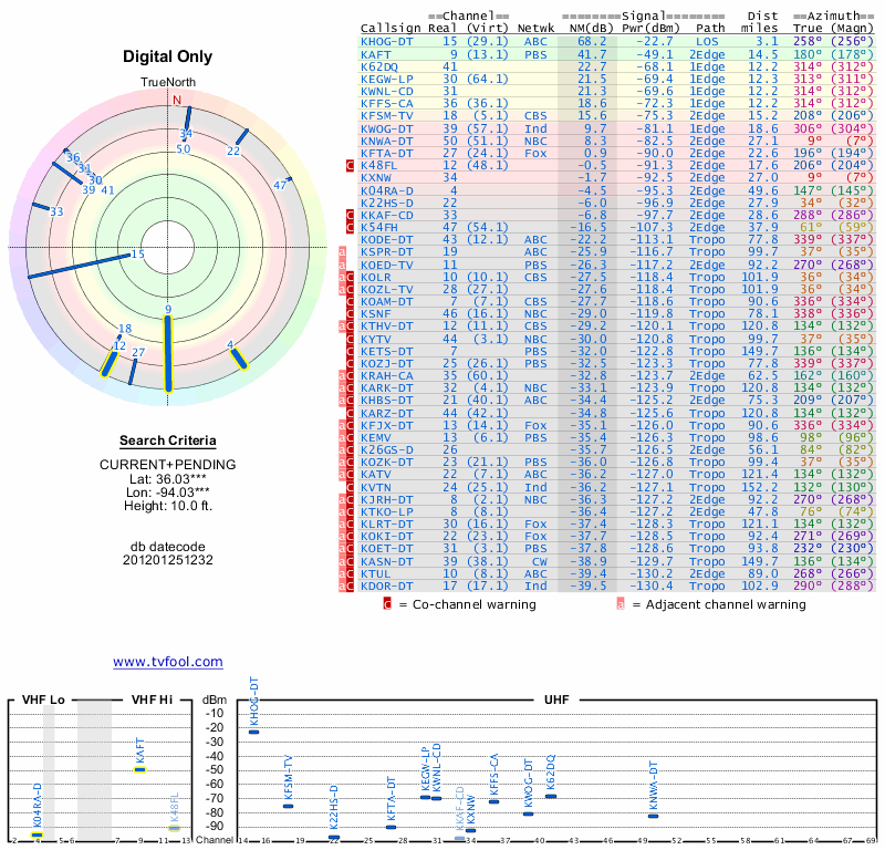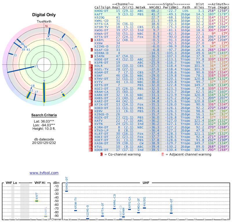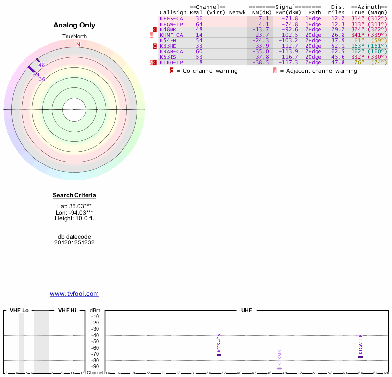 Here are the results for your location. The transmitter database was last updated on June 7, 2013. For more information about these plots and how to interpret them, please check out the Signal Analysis FAQ.