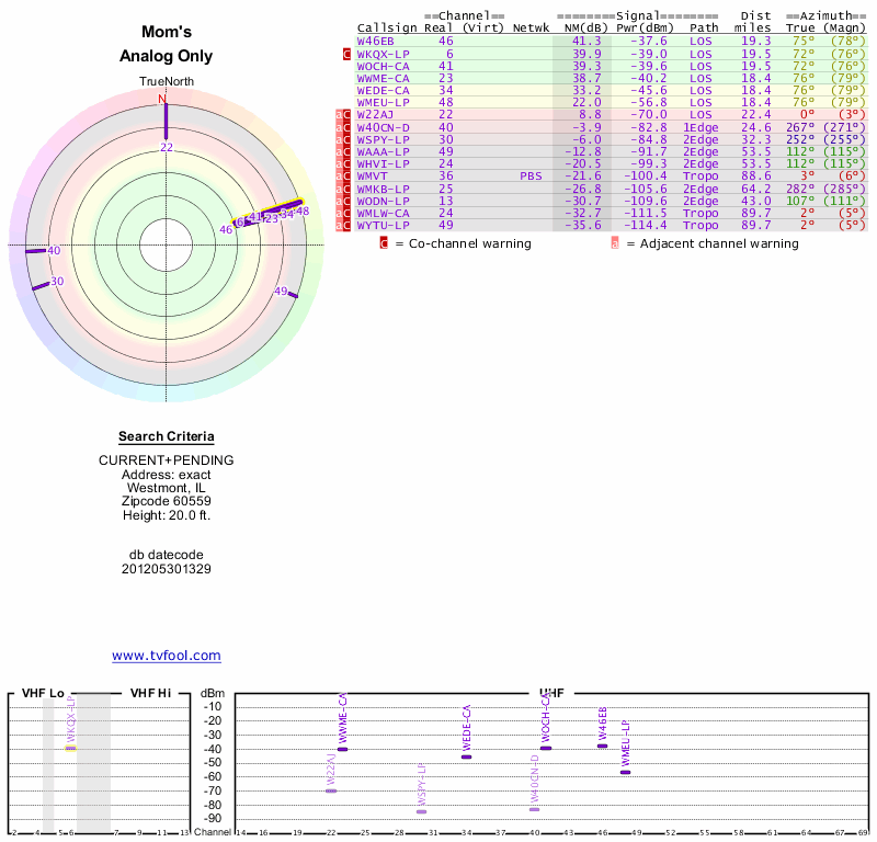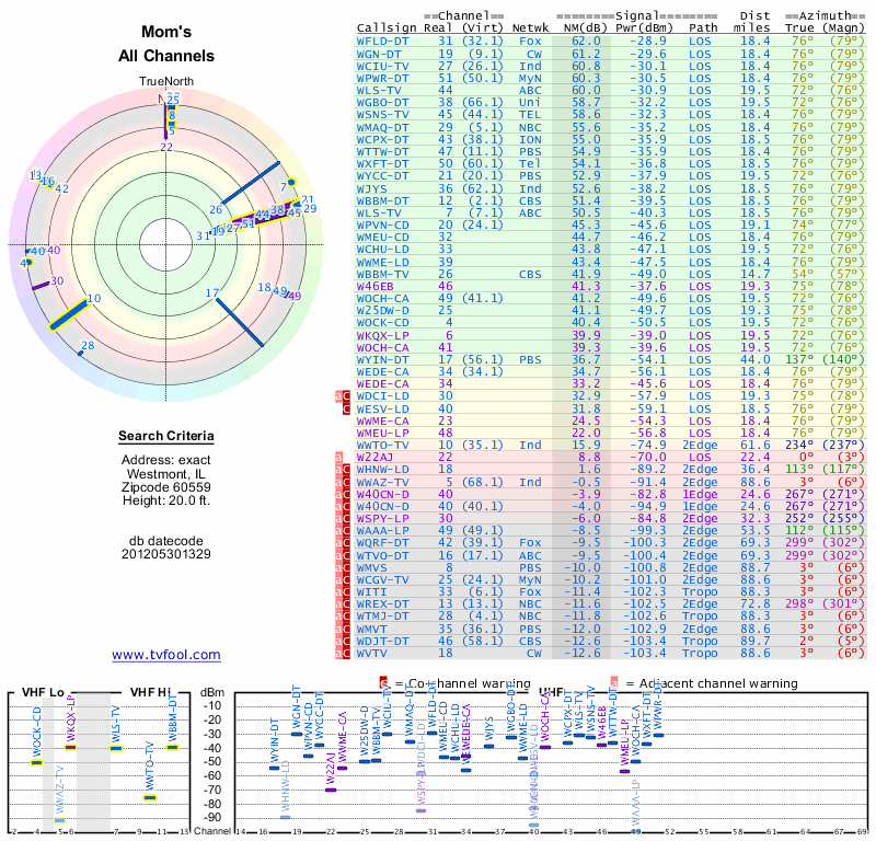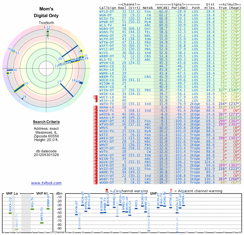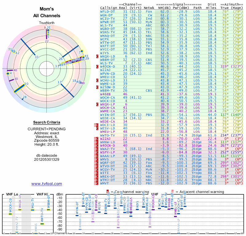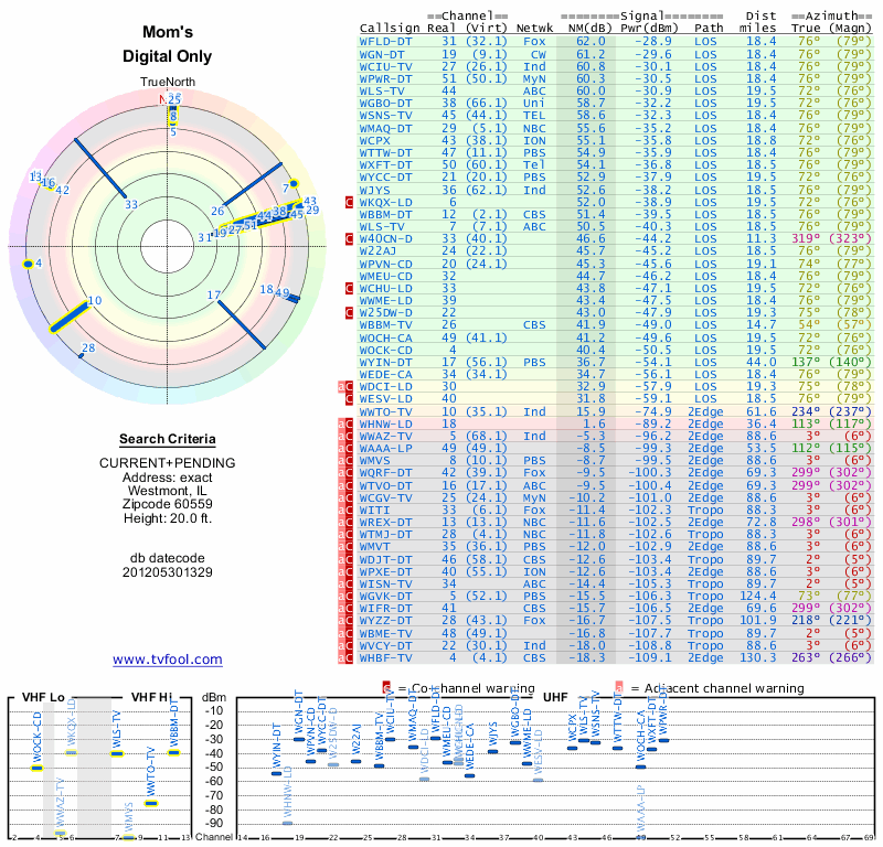 Here are the results for your location. The transmitter database was last updated on June 7, 2013. For more information about these plots and how to interpret them, please check out the Signal Analysis FAQ.
