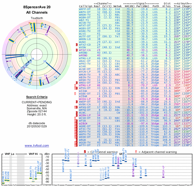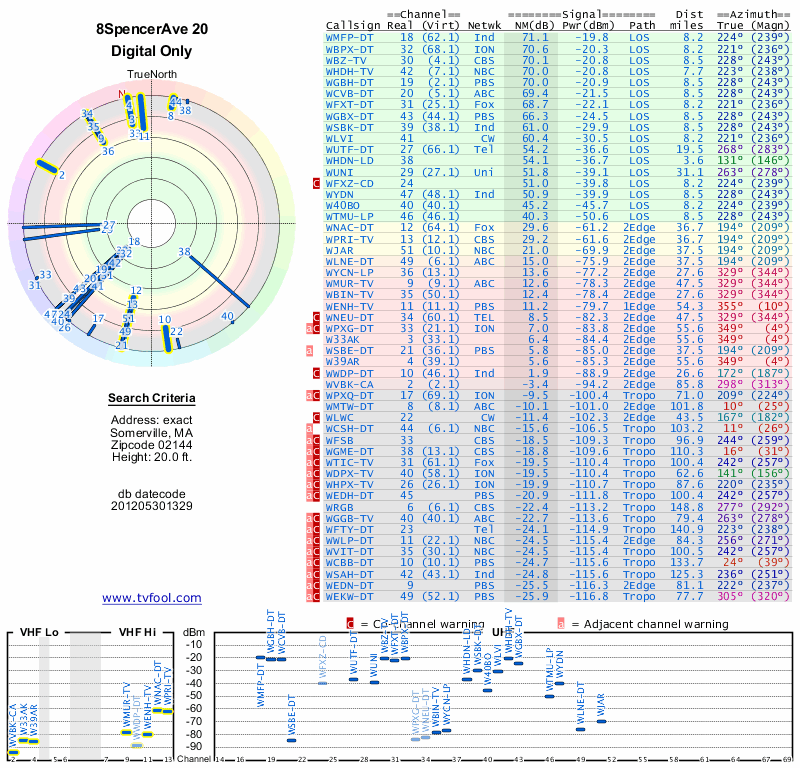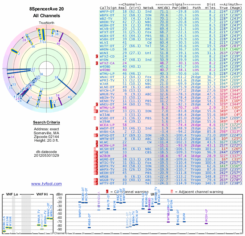 Here are the results for your location. The transmitter database was last updated on June 7, 2013. For more information about these plots and how to interpret them, please check out the Signal Analysis FAQ.