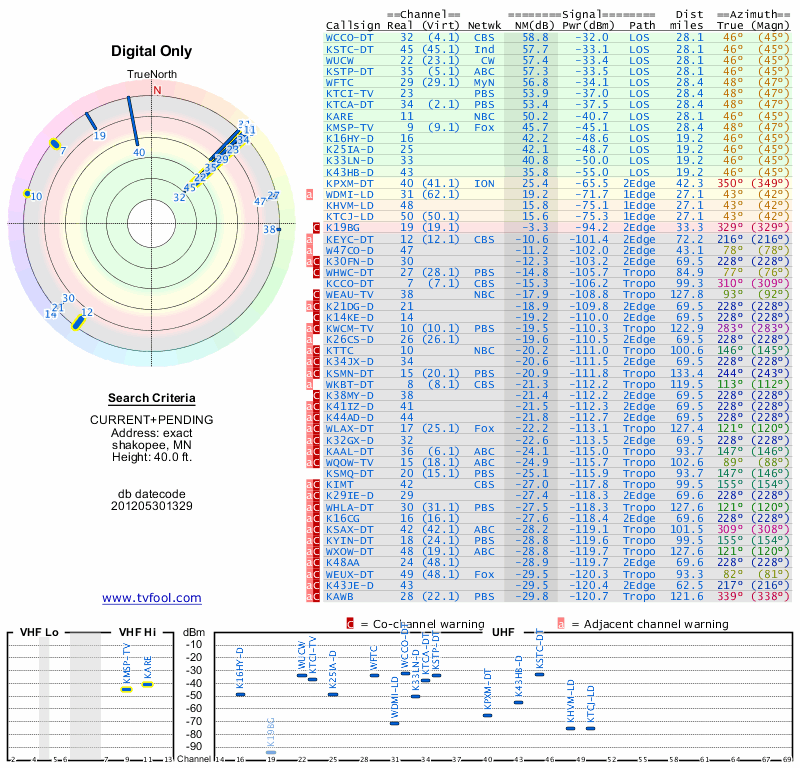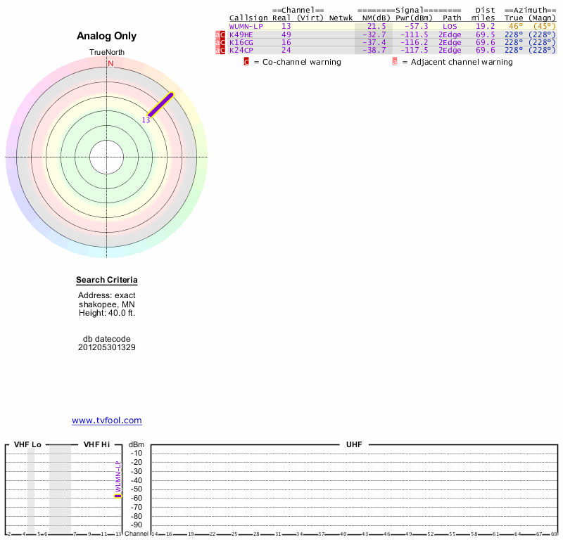 Here are the results for your location. The transmitter database was last updated on June 7, 2013. For more information about these plots and how to interpret them, please check out the Signal Analysis FAQ.