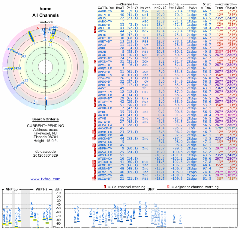 Here are the results for your location. The transmitter database was last updated on June 7, 2013. For more information about these plots and how to interpret them, please check out the Signal Analysis FAQ.
