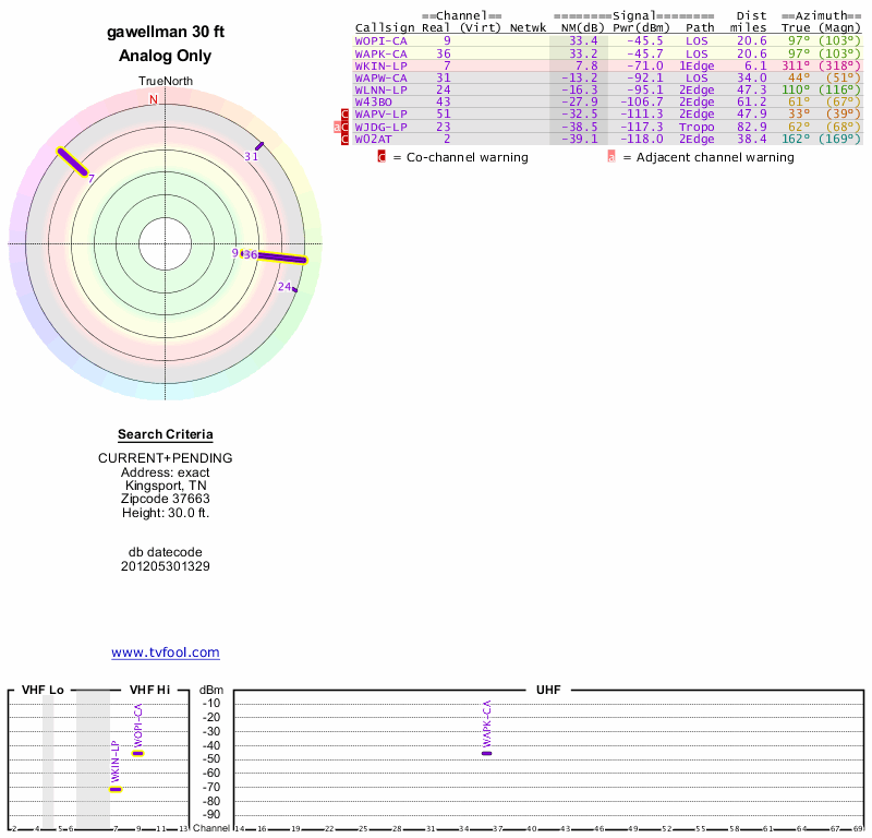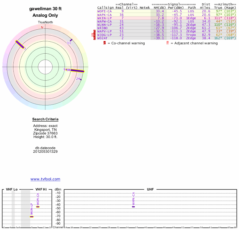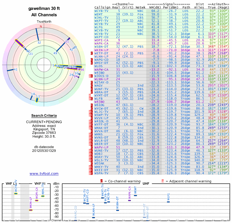 Here are the results for your location. The transmitter database was last updated on June 7, 2013. For more information about these plots and how to interpret them, please check out the Signal Analysis FAQ.