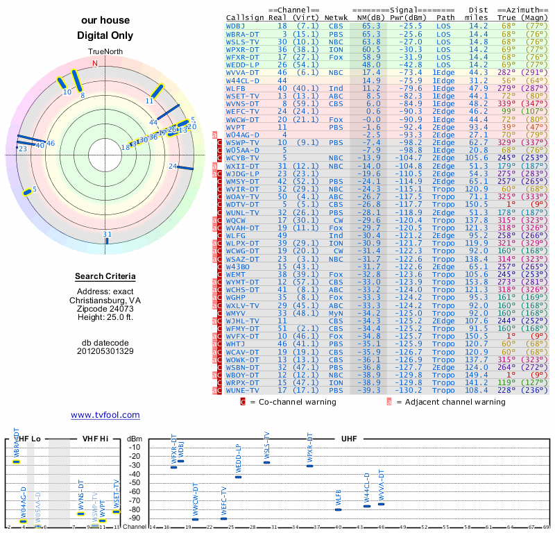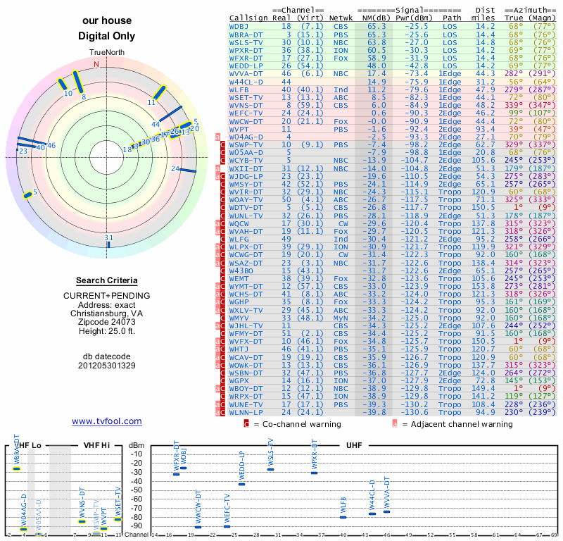 Here are the results for your location. The transmitter database was last updated on June 7, 2013. For more information about these plots and how to interpret them, please check out the Signal Analysis FAQ.