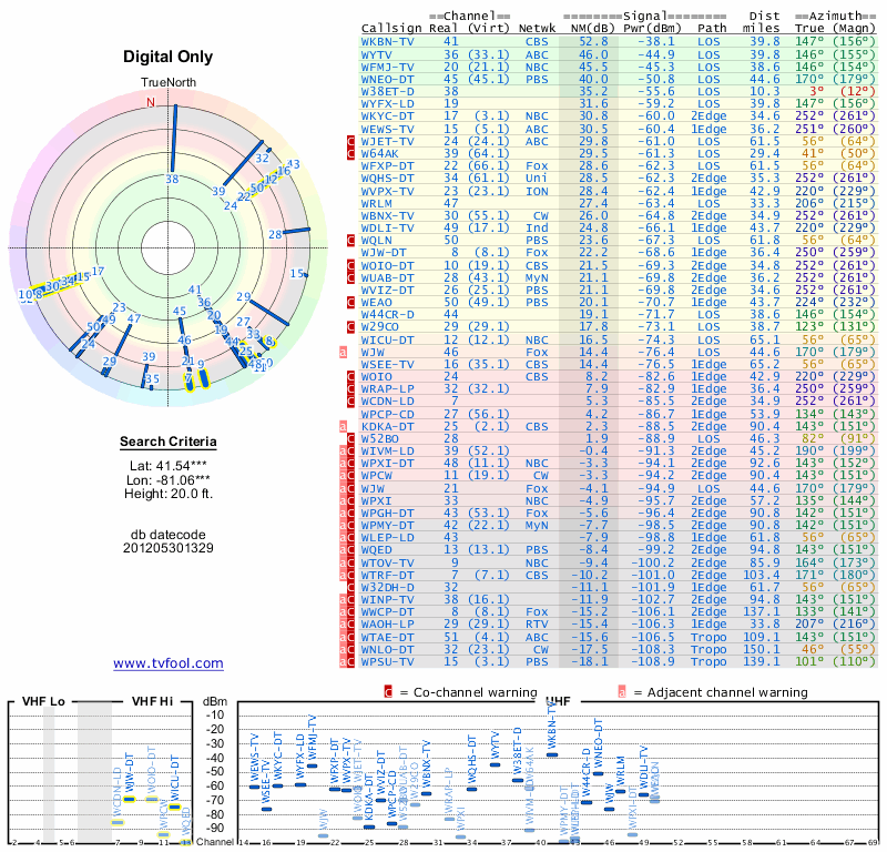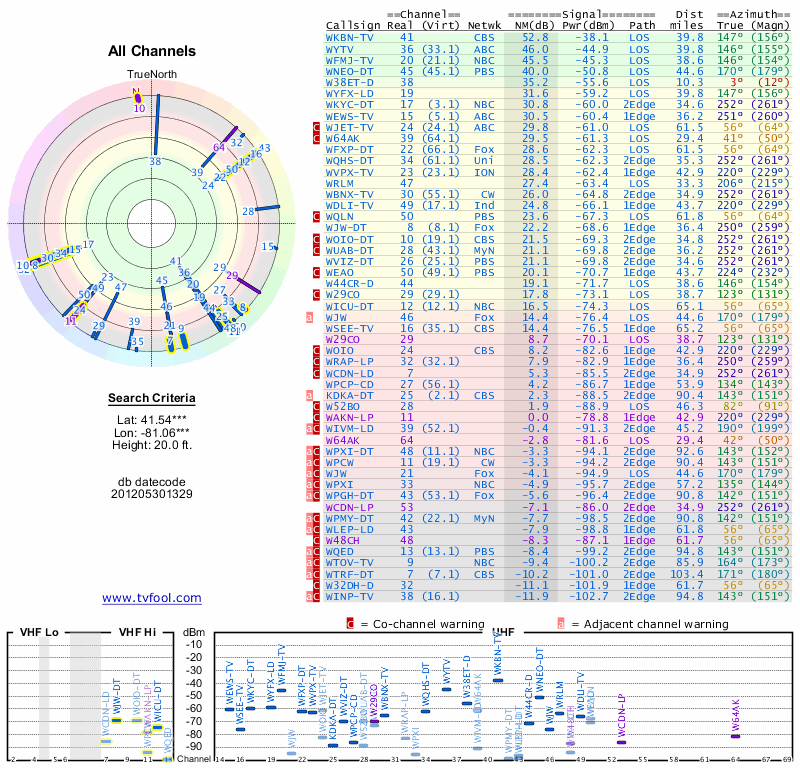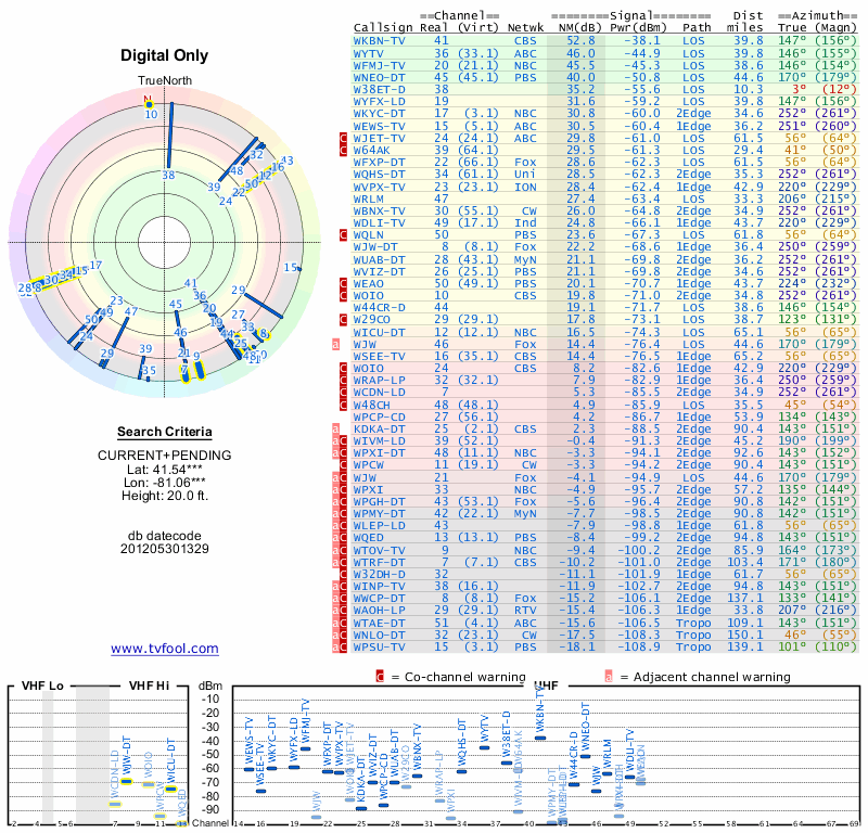 Here are the results for your location. The transmitter database was last updated on June 7, 2013. For more information about these plots and how to interpret them, please check out the Signal Analysis FAQ.