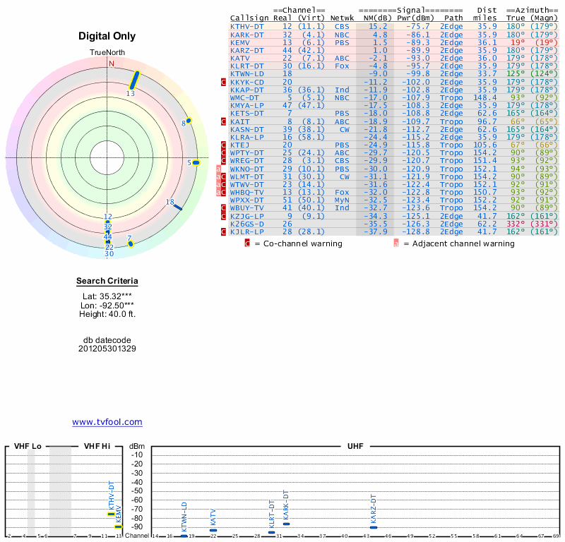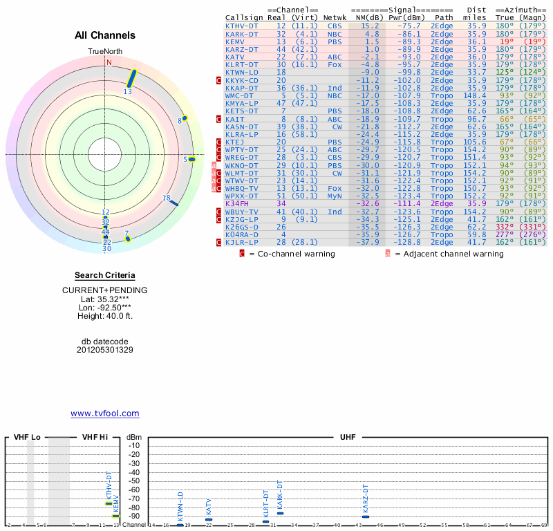 Here are the results for your location. The transmitter database was last updated on June 7, 2013. For more information about these plots and how to interpret them, please check out the Signal Analysis FAQ.