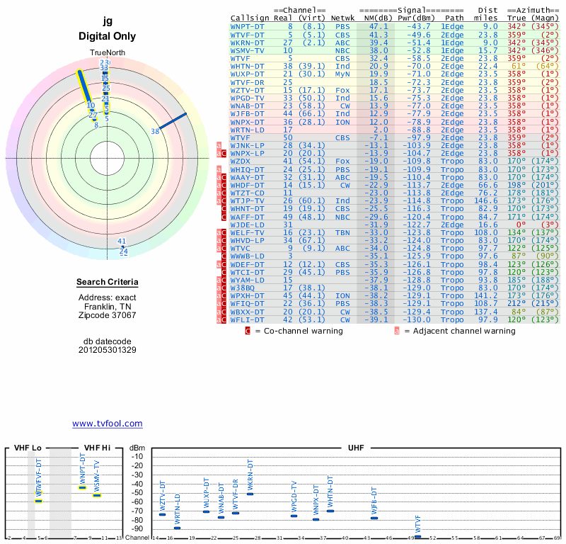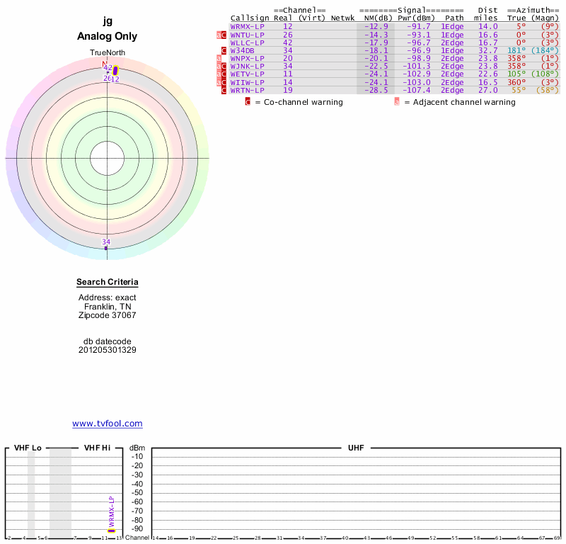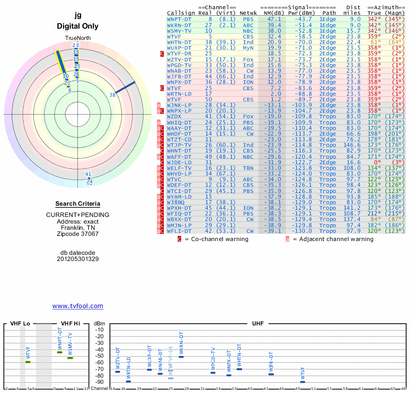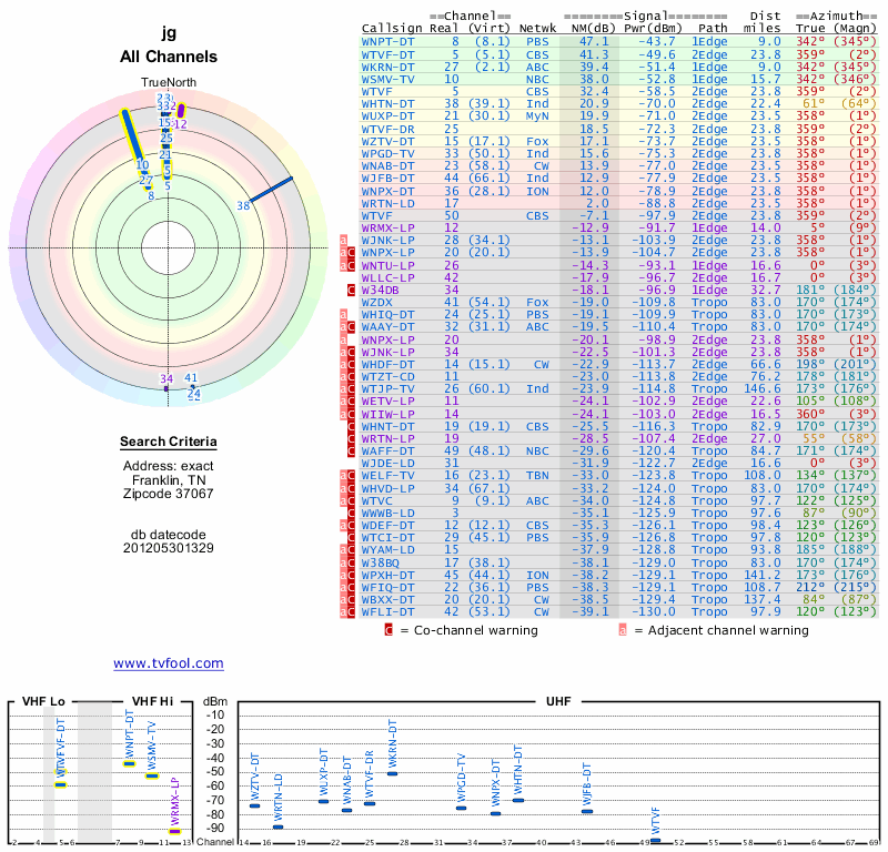 Here are the results for your location. The transmitter database was last updated on June 7, 2013. For more information about these plots and how to interpret them, please check out the Signal Analysis FAQ.